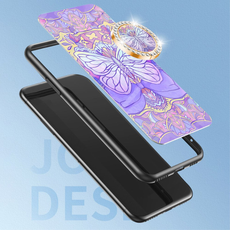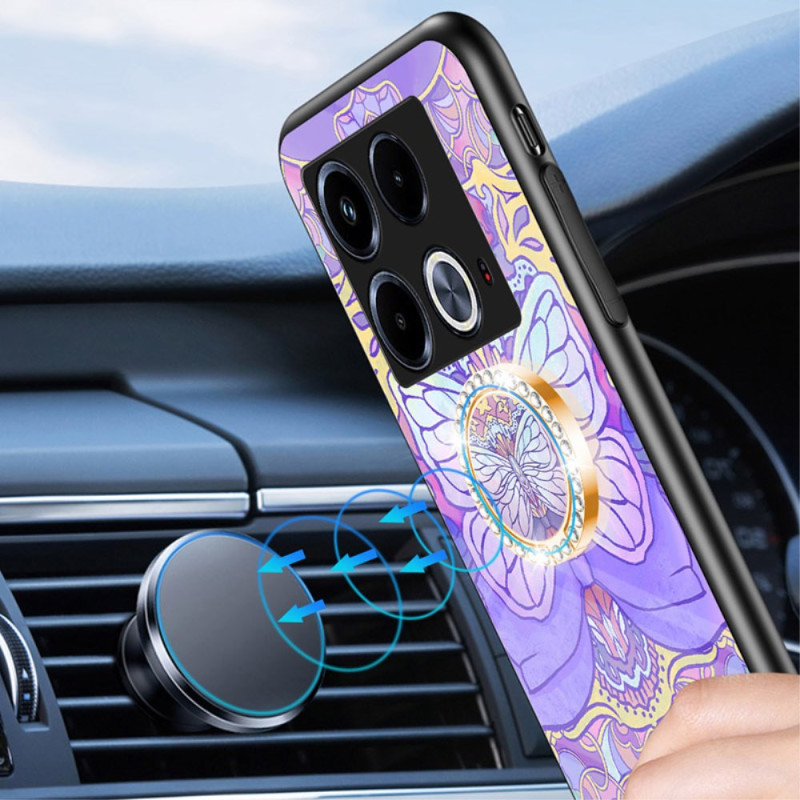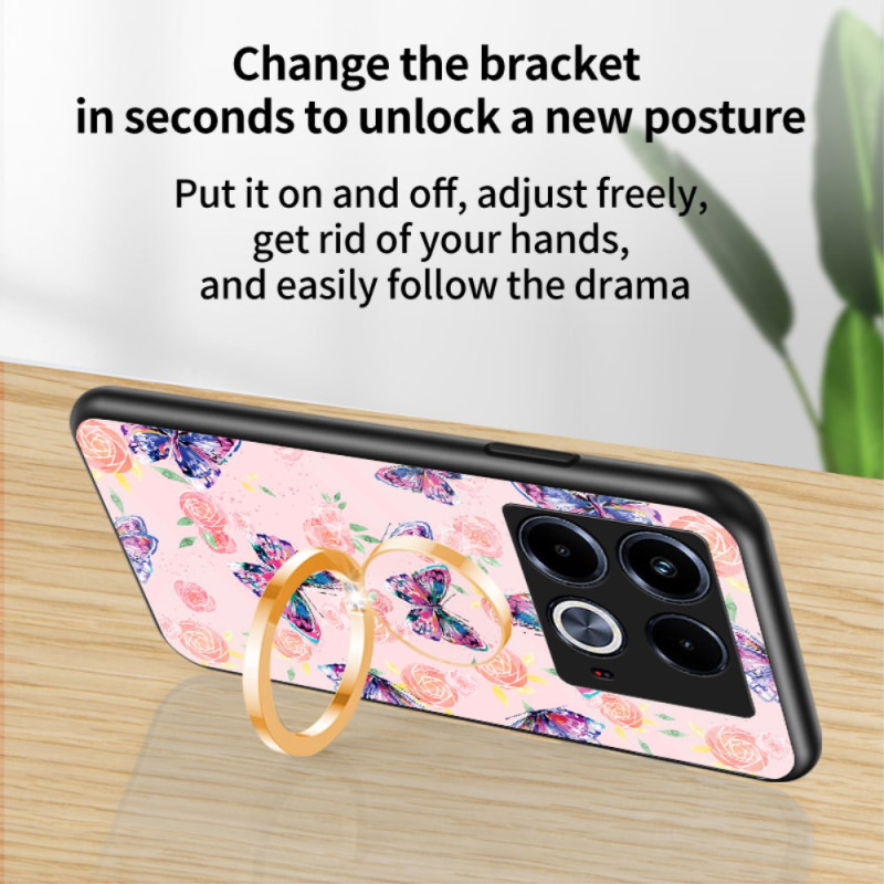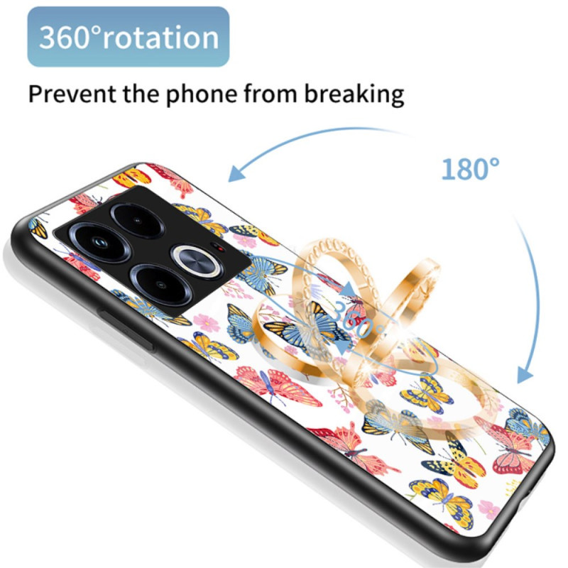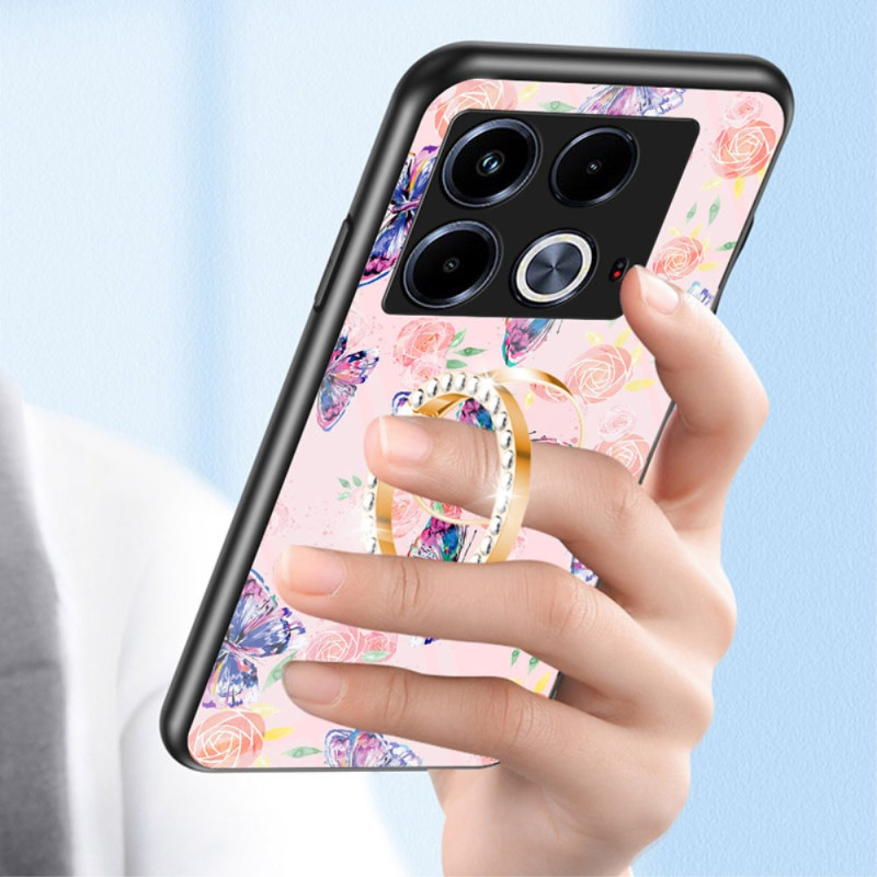 Proteja su Infinix Note 40 con estilo gracias a esta resistente funda de cristal templado. Su diseño multicapa combina plástico duro, borde de TPU suave y parte trasera de cristal para una protección óptima contra impactos. El anillo de soporte metálico plegable ofrece una visión cómoda.