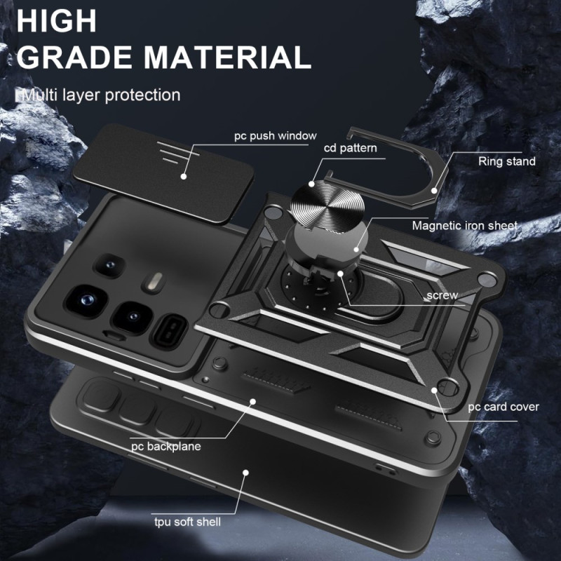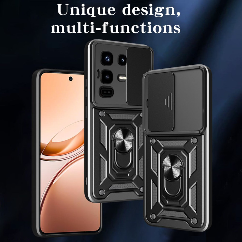 Protege tu Infinix Note 50 Pro 4G con esta funda multifunción que incluye una protección deslizante para la cámara, un soporte giratorio de 360° y una placa magnética integrada. Diseño robusto que ofrece protección contra impactos de grado militar.