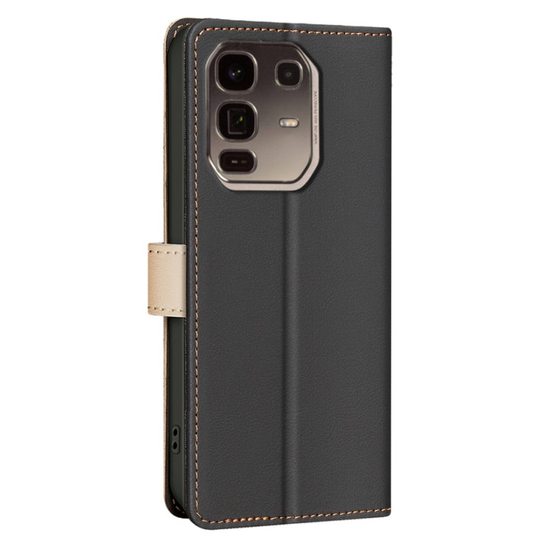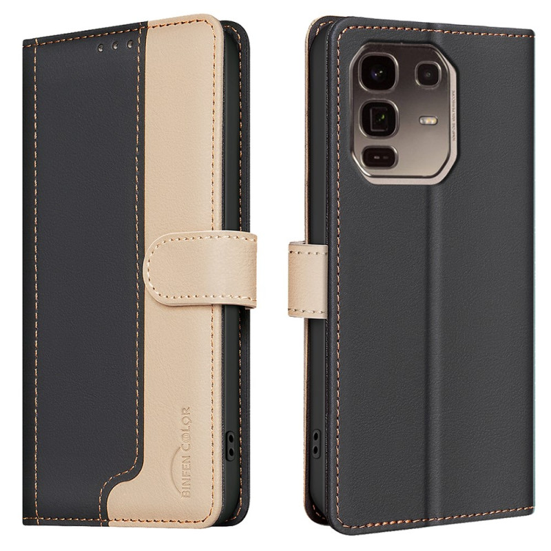 Elegante funda tipo cartera con protección RFID integrada para tu Infinix Note 50 Pro Plus 5G. Sofisticado diseño bicolor, 3 ranuras para tarjetas y 1 compartimento para efectivo. Soporte integrado para una visualización manos libres y una protección completa.