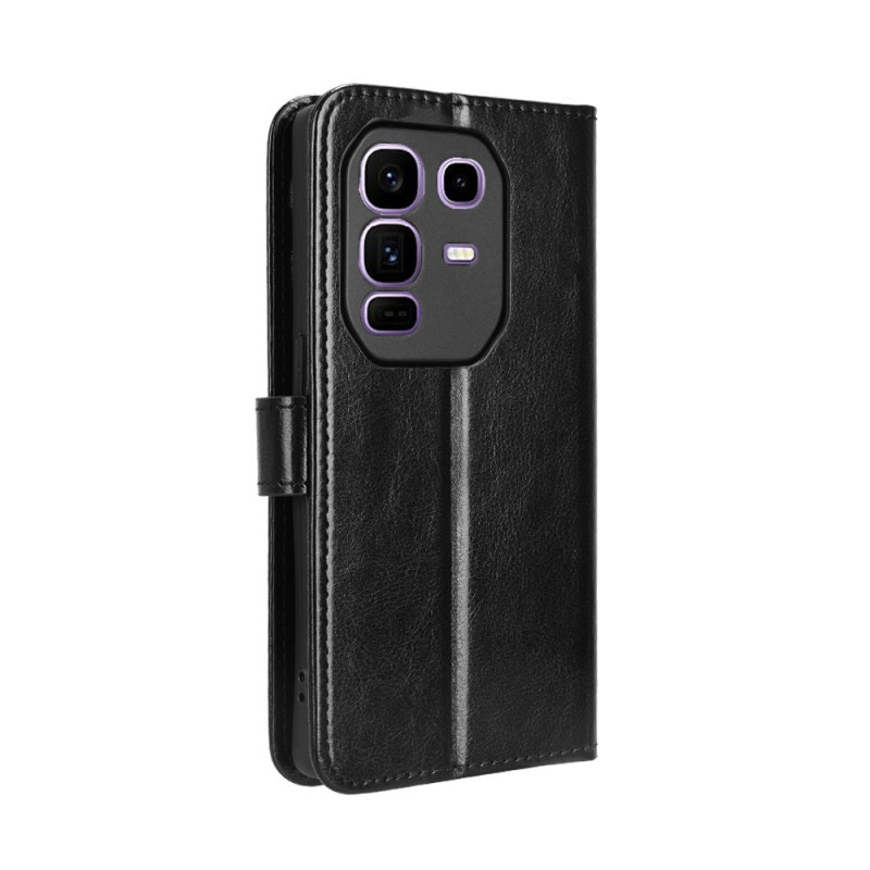 Elegante funda monedero de piel de PU con textura de caballo loco para Infinix Note 50 Pro Plus 5G. Con 3 ranuras para tarjetas, un compartimento para billetes, un cierre magnético seguro y una práctica colgante de mano. Soporte manos libres integrado.