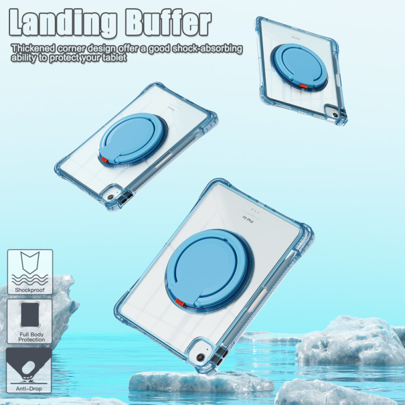 Descubre nuestra versátil funda para iPad Air 11 (2025) (2024)/Air (2022) (2020)/ Pro 11 (2022) (2021) (2020) (2018), con asa giratoria de 360°, protección de todo el cuerpo, esquinas que absorben los golpes, soporte ajustable, parte trasera de acrílico transparente y colgante ajustable de nailon para el hombro.