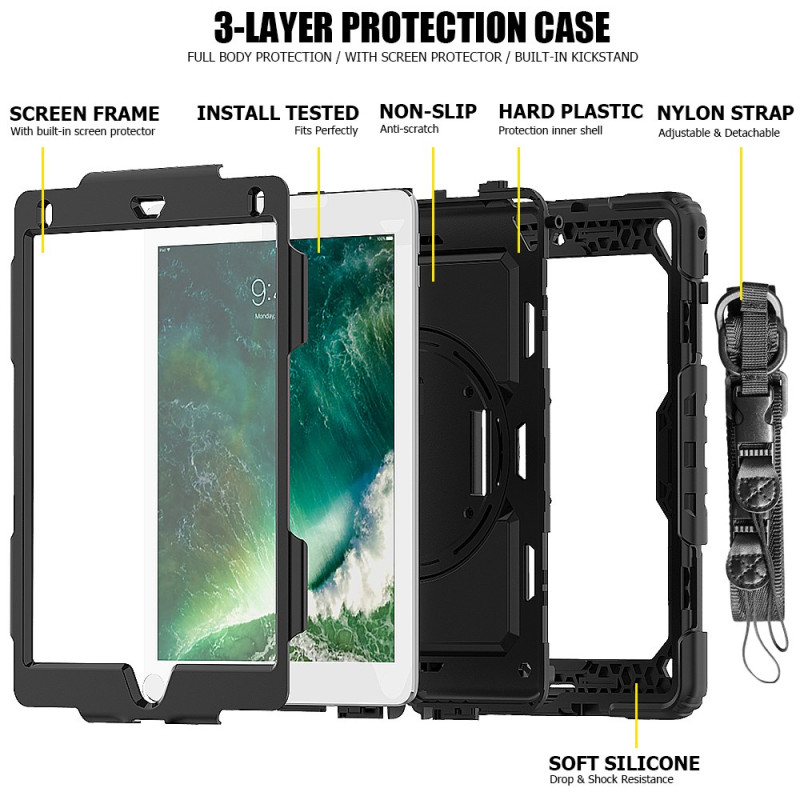 Protégez votre iPad avec élégance grâce à cette coque robuste tout-en-un. Conception hybride anti-choc, support rotatif 360°, sangle de main ajustable et bandoulière détachable incluse. Film protecteur et porte-stylet intégrés pour une...