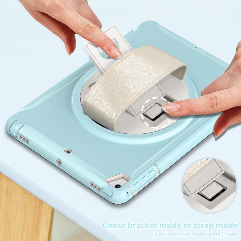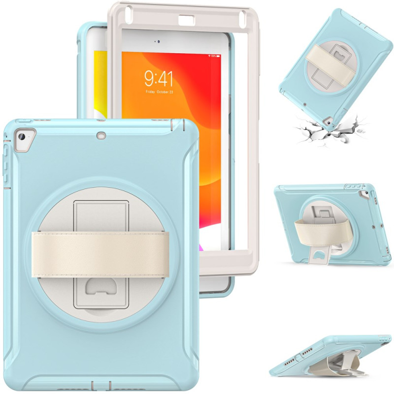 Protégez votre iPad (9.7 pouces) / iPad Pro 9.7 / iPad Air / iPad Air 2 avec style grâce à cette coque robuste à double couche. Dotée d'un support rotatif à 360° et d'une sangle ajustable, elle offre une protection optimale contre les chocs et rayures tout en libérant vos mains pour un visionnage confortable.
