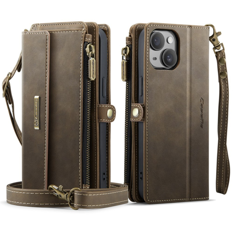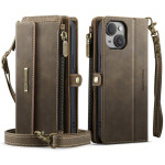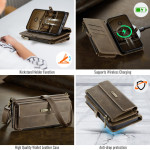 Funda cartera multifunción para iPhone 13 Mini con tecnología anti-RFID. Incluye 9 ranuras para tarjetas, bolsillo con cremallera y soporte para manos libres. Diseño versátil para llevar como bandolera o clutch.