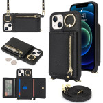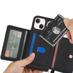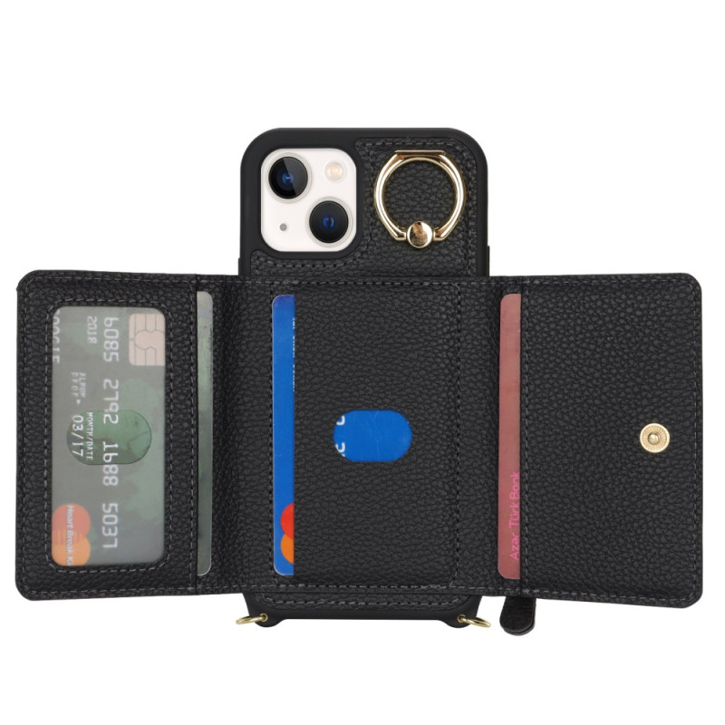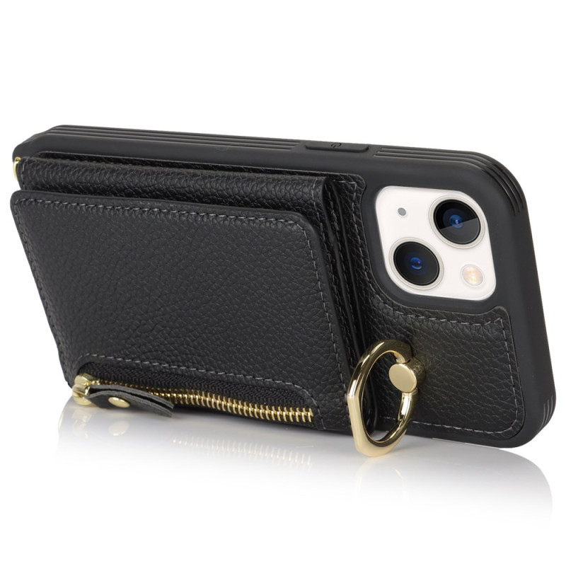 Funda multifuncional de piel de PU y TPU para iPhone 13 Mini. Bolsillo con cremallera integrado para tus objetos personales, ranuras para tarjetas de crédito y anillo de soporte giratorio. Incluye una colgante de hombro desmontable para llevarla cómodamente a diario.