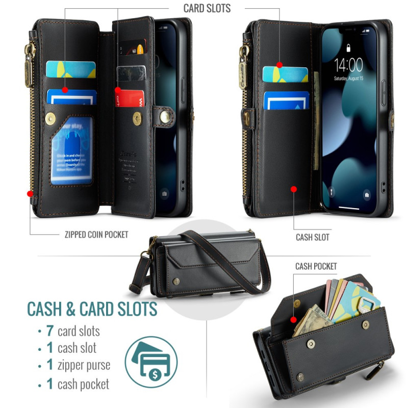 Descubra la funda multifunción CASEME para iPhone 13 mini: protección RFID, 10 ranuras para tarjetas, monedero con cremallera y bandolera extraíble. Combine estilo, seguridad y practicidad con esta cartera de piel de PU de primera calidad.