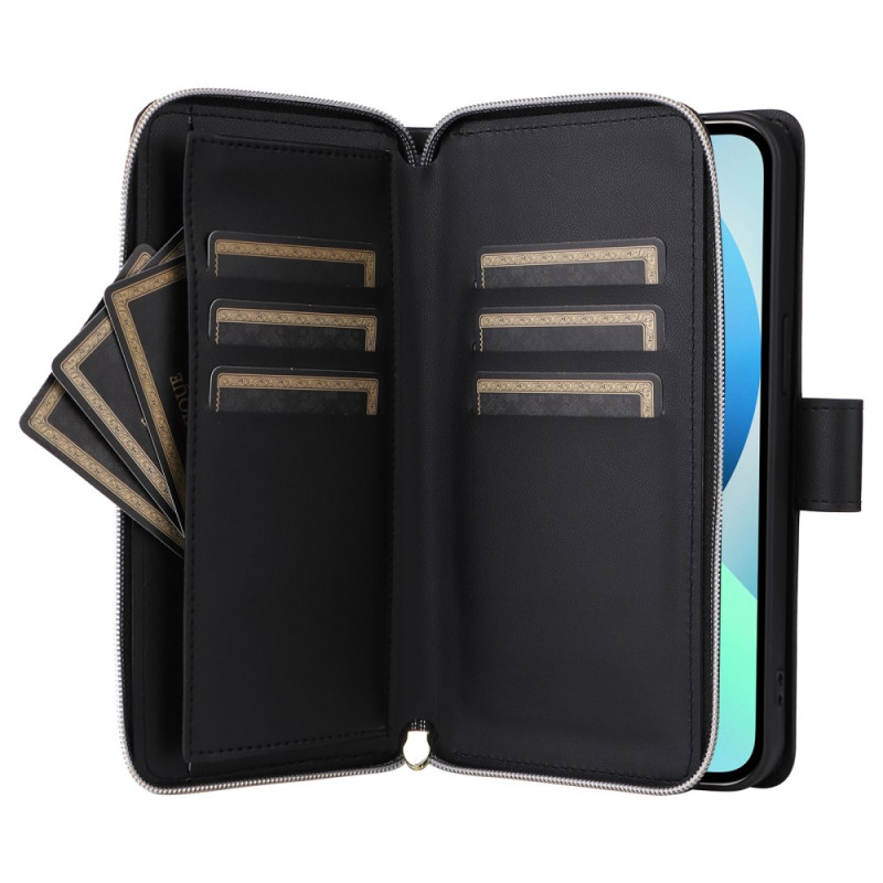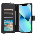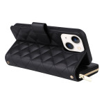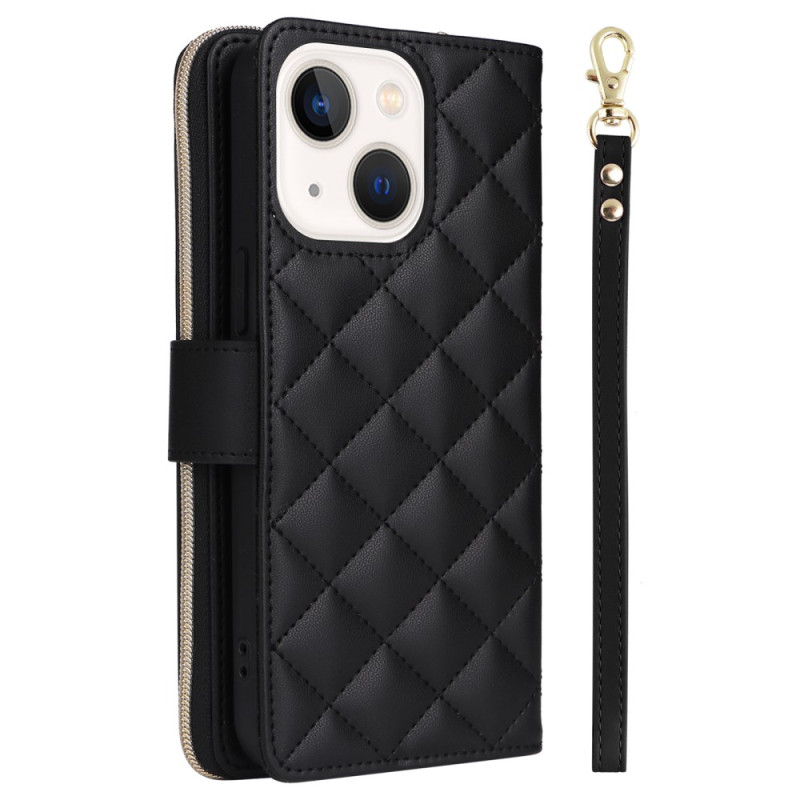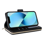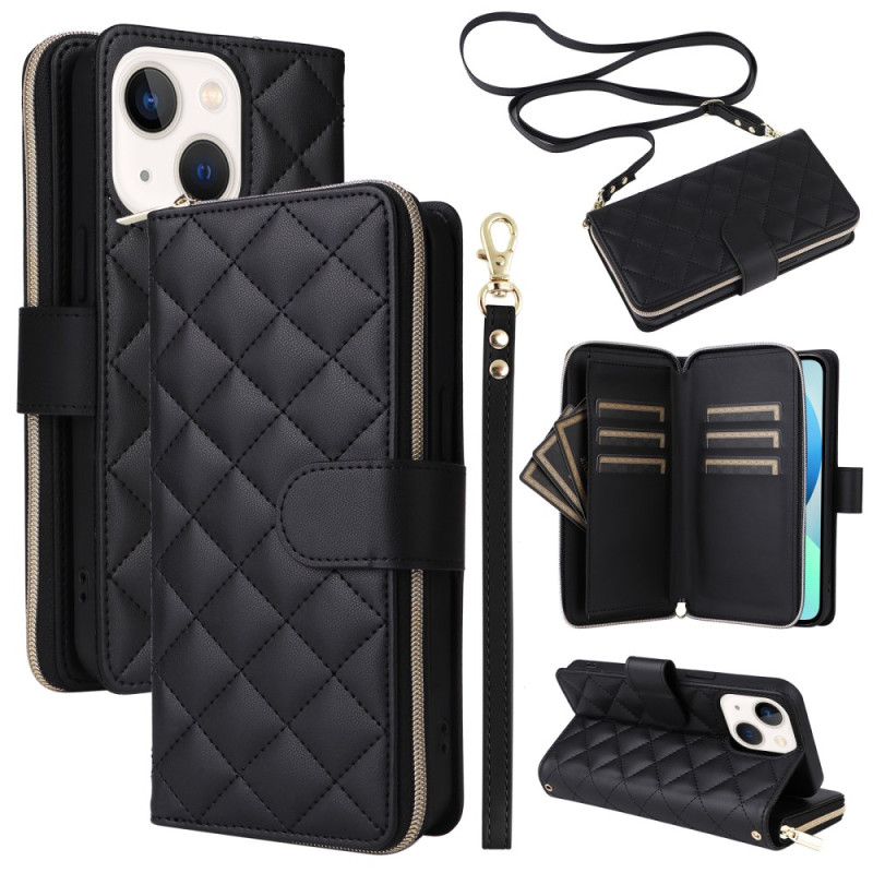 Elegante funda cartera en piel de PU con cremallera para iPhone 13 mini. Refinado diseño acolchado, múltiples compartimentos para tarjetas y efectivo, bolsillo adicional con cremallera. Función de soporte integrada y colgante de hombro ajustable para facilitar su transporte.