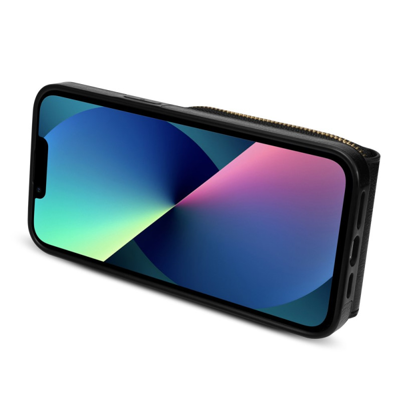 Elegante funda multifunción para iPhone 13 mini que combina protección reforzada, tarjetero seguro con cremallera y soporte integrado. Incluye una colgante ajustable para el hombro que permite llevarla cómodamente a diario.
