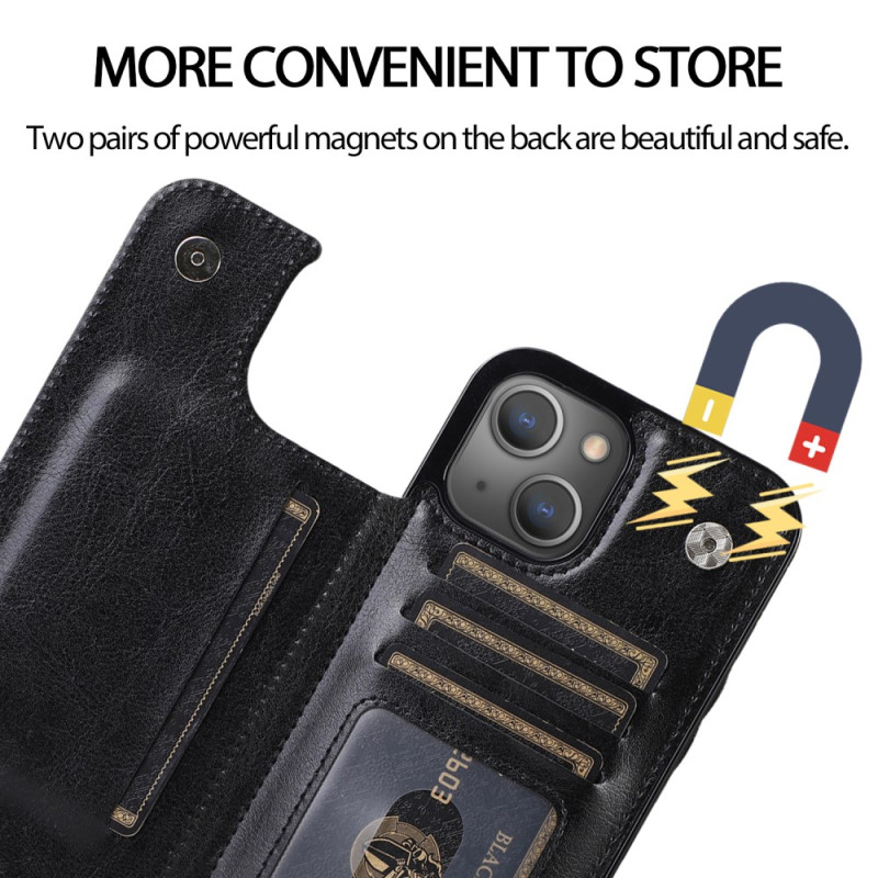 Protege tu iPhone 13 Mini con estilo gracias a esta funda de piel de PU texturizada con efecto Crazy Horse. Dispone de tarjetero integrado, soporte manos libres y doble cierre magnético para una seguridad óptima.