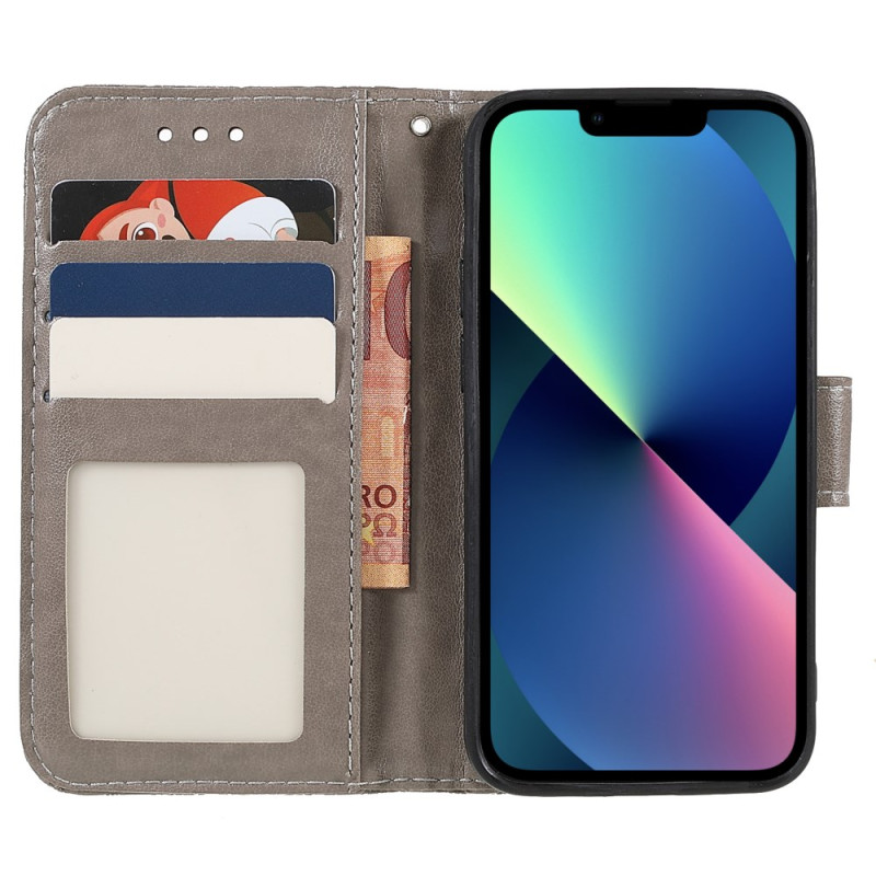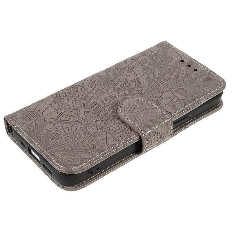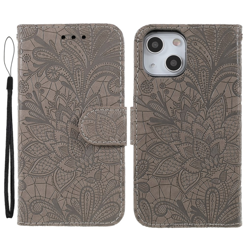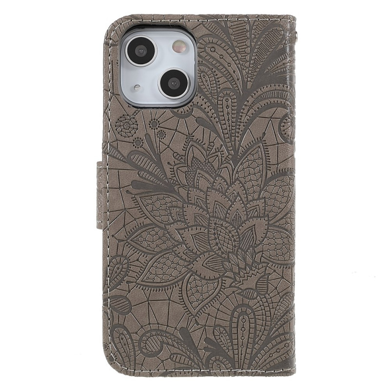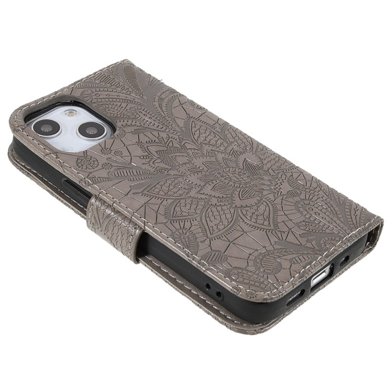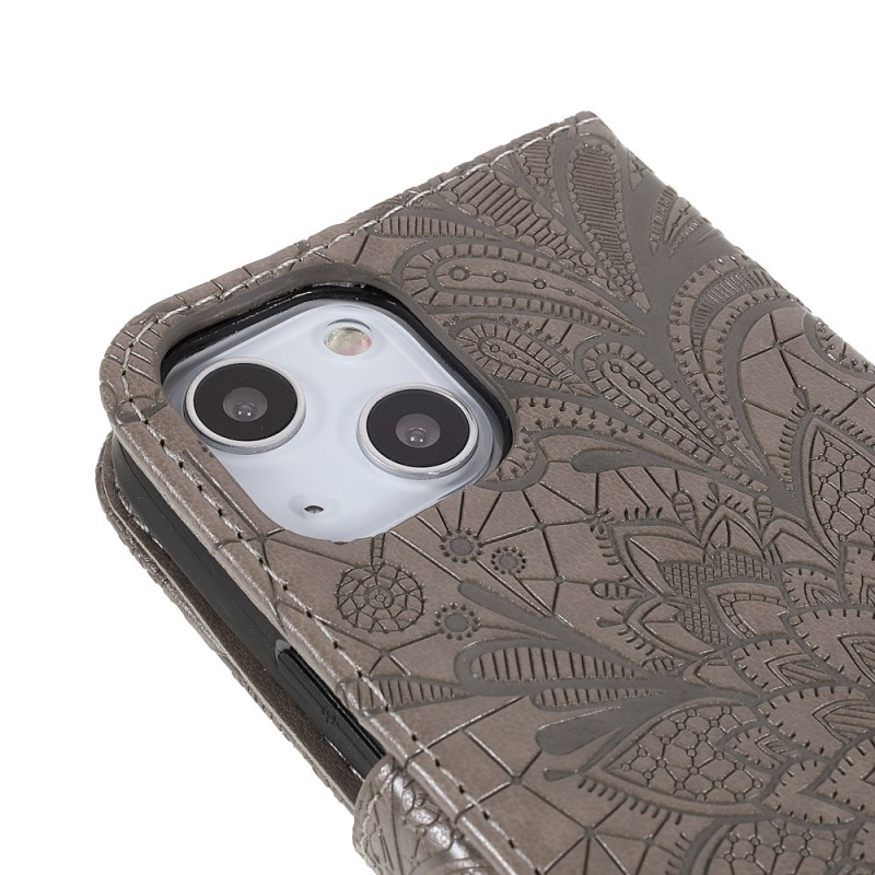 Descubra esta elegante funda cartera con solapa que presenta un motivo floral de encaje. Con múltiples ranuras para tarjetas, una práctica función de soporte y una colgante de muñeca segura, combina un estilo refinado con una protección óptima para su iPhone 13 mini.