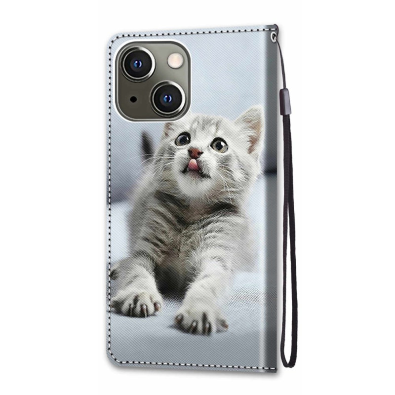 Protege tu iPhone 13 Mini con estilo gracias a esta funda cartera con un elegante motivo de gato gris. Cuenta con un práctico soporte desplegable, múltiples ranuras para tarjetas y una cómoda colgante de mano.