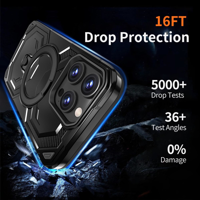 Protege tu iPhone 13 Pro Max con esta funda híbrida de PC + TPU ultrarresistente. Con un anillo magnético multifuncional que actúa como soporte y es compatible con cargadores inalámbricos, combina la máxima protección con la practicidad diaria.