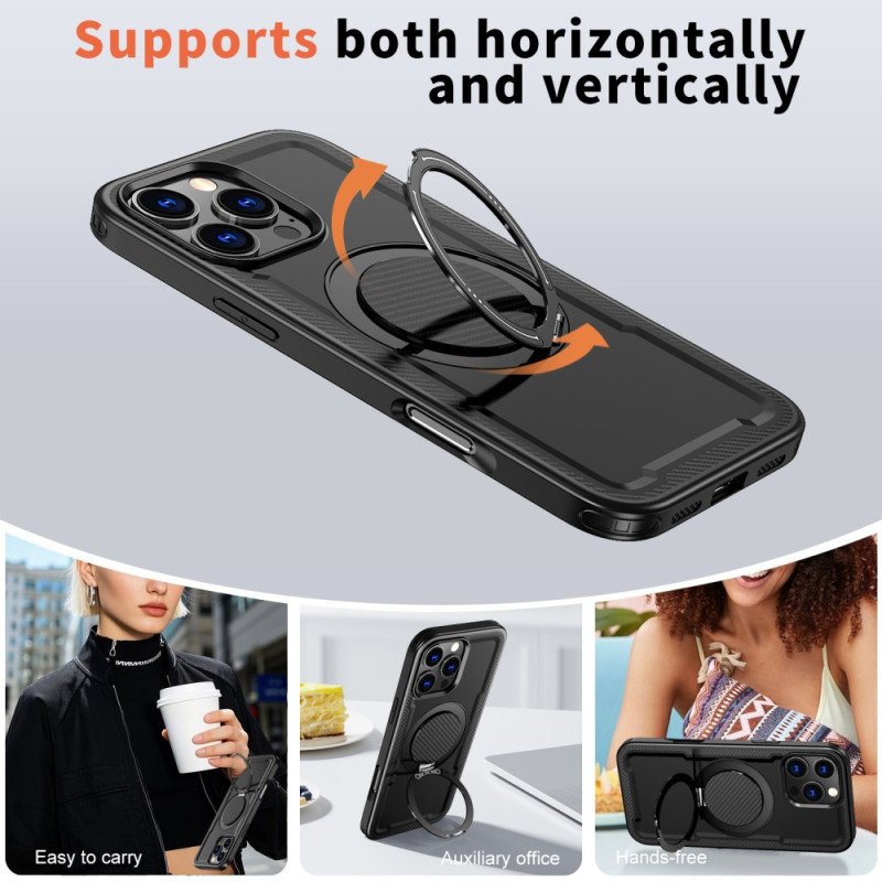 Proteja su iPhone con estilo gracias a esta innovadora funda compatible con MagSafe. Con un soporte giratorio de 360°, ofrece una mayor protección y facilita la visualización con manos libres. Construcción híbrida duradera y recortes precisos para un acceso óptimo.