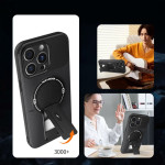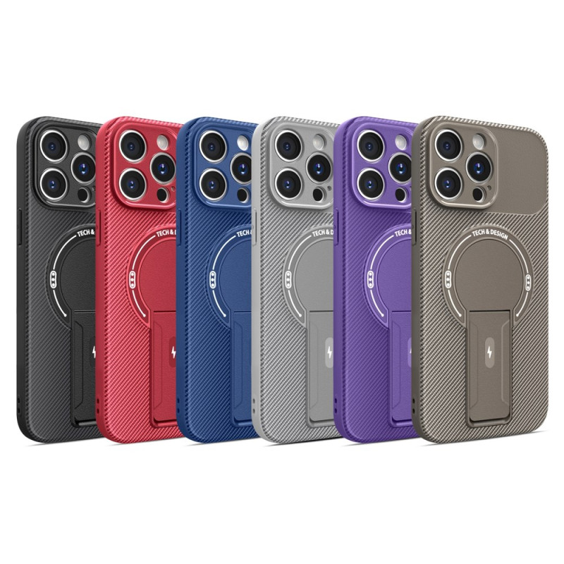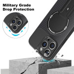 Robusta protección para el iPhone 13 Pro Max con textura de fibra de carbono y soporte integrado. El diseño híbrido resistente a impactos ofrece protección de grado militar, revestimiento antiarañazos y es compatible con el soporte magnético para coche.