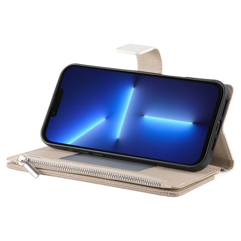 Funda multifunción en piel de PU de primera calidad para iPhone 13 Pro Max. Combina elegancia y practicidad con múltiples compartimentos para tarjetas, monedas y billetes. Diseño sofisticado con bandolera ajustable para llevarla con las manos libres.