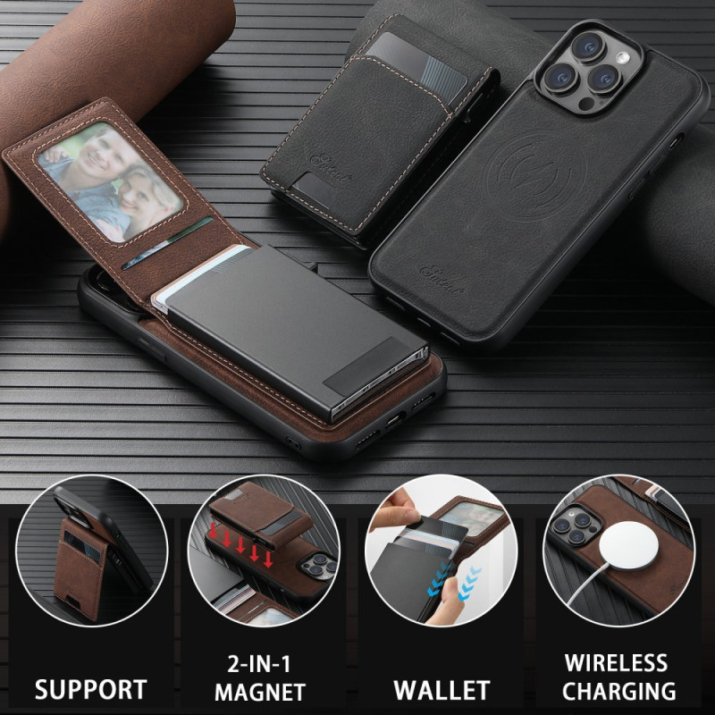 Descubre la funda SUTENI para iPhone 13 Pro Max: diseño 2 en 1 desmontable con tarjetero magnético integrado con capacidad para 6-8 tarjetas. Función de soporte ajustable, compatible con carga inalámbrica MagSafe y soporte magnético para coche.