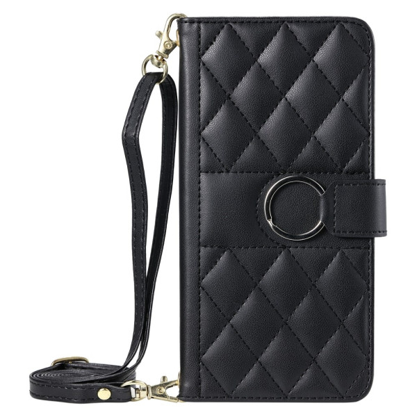 Elegante funda monedero de piel PU para iPhone 13 Pro Max con sofisticado estampado de diamantes. Incluye un anillo decorativo, 5 ranuras para tarjetas, bolsillo monedero y función de soporte. Se suministra con dos correas.