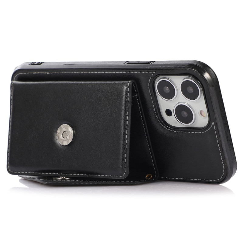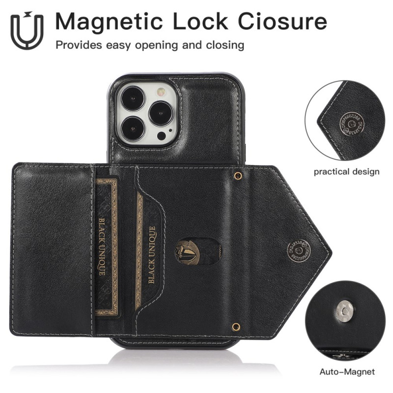 Elegante funda multifunción para el iPhone 13 Pro Max que combina protección de primera calidad y practicidad. Incluye un tarjetero magnético, un soporte de visualización manos libres y una colgante de hombro desmontable ajustable de 1,5 m para facilitar su uso diario.