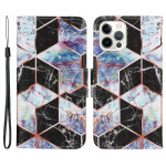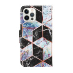 Protege tu iPhone 13 Pro Max con estilo gracias a esta funda cartera multifunción con un sofisticado diseño geométrico negro. Con ranuras para tarjetas integradas y una práctica colgante de mano, sirve también de soporte para tener las manos libres.