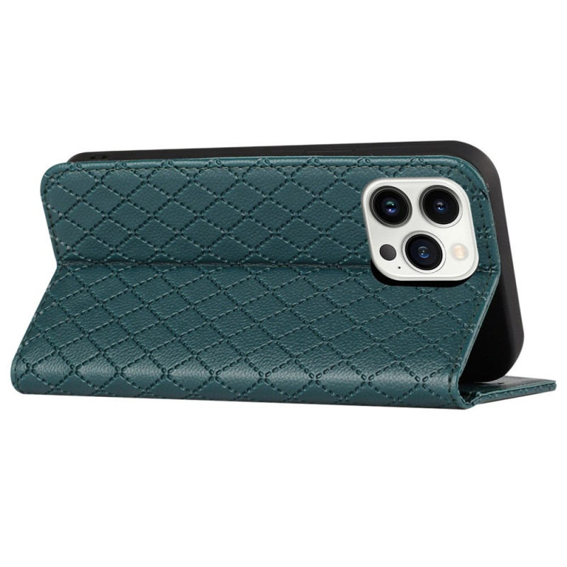 Protege tu iPhone 13 Pro Max con estilo con esta funda cartera multifunción. Con una refinada textura de lichi y un estampado de diamantes en relieve, combina estilo y practicidad con ranuras para tarjetas y protección RFID integrada.