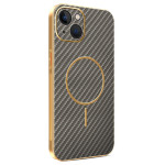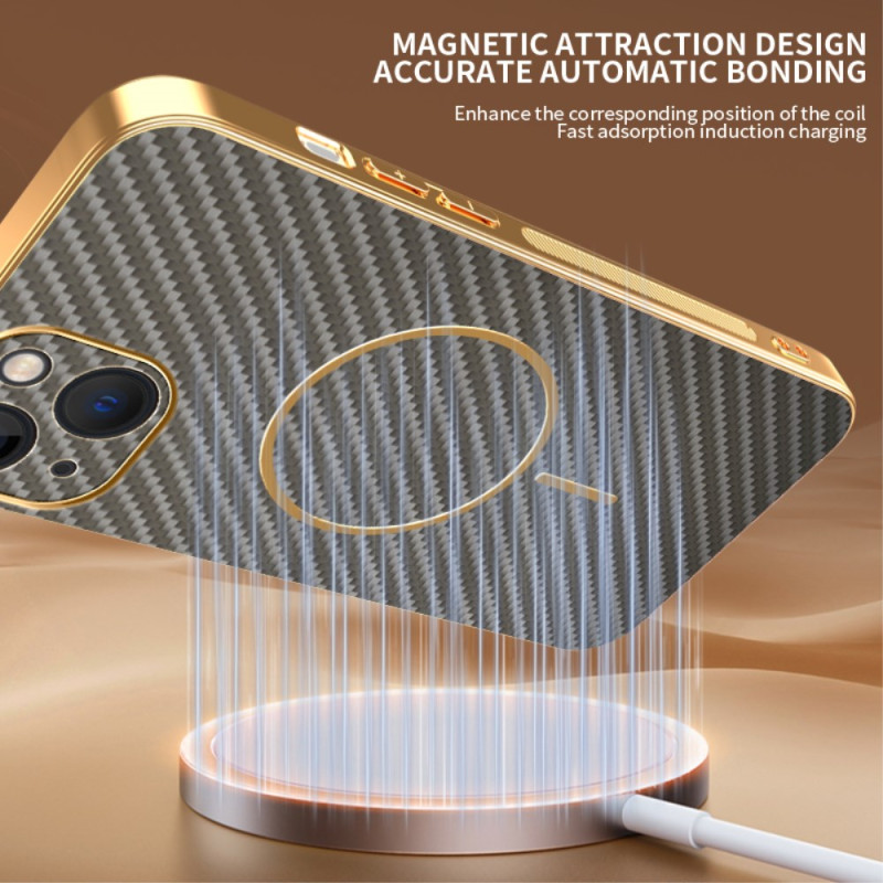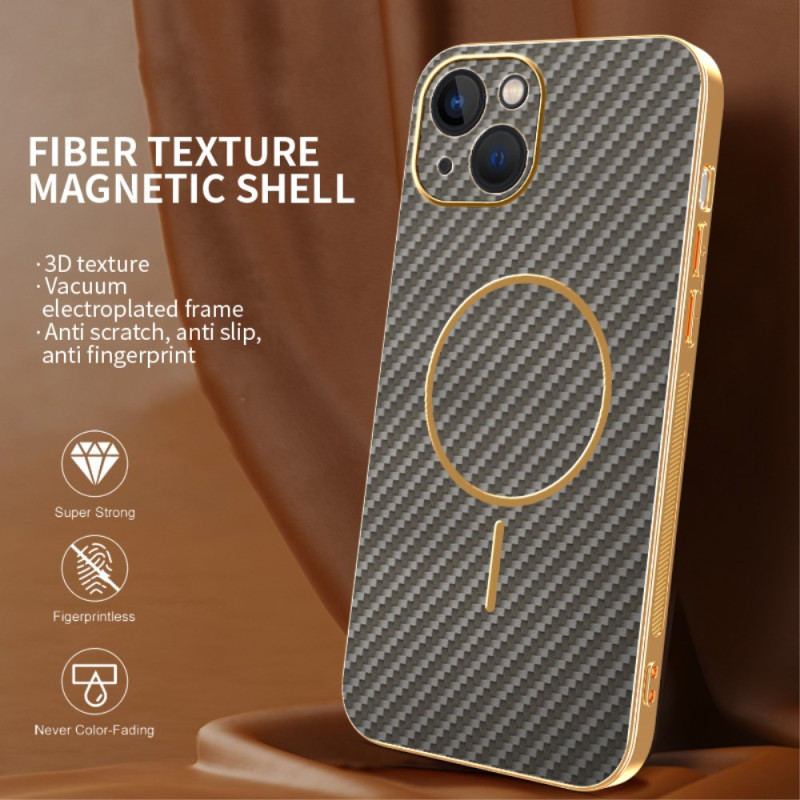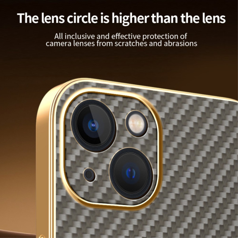 Descubre nuestra elegante y duradera funda protectora para iPhone 13. Fabricada en TPU flexible con acabado galvánico y textura de fibra de carbono, ofrece una excelente absorción de impactos y una estética refinada. La funda resiste las huellas, protege la cámara y la pantalla, y proporciona un agarre seguro.
