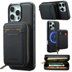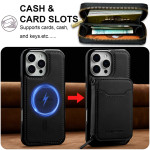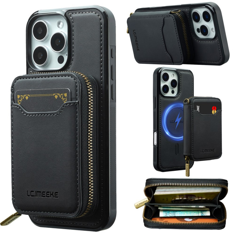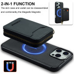 Innovadora funda 2 en 1 con monedero desmontable con cremallera y protección magnética. Guarda de forma segura más de 10 tarjetas, dinero en efectivo y llaves. Protección antifraude RFID integrada. Compatible con MagSafe para un uso versátil.