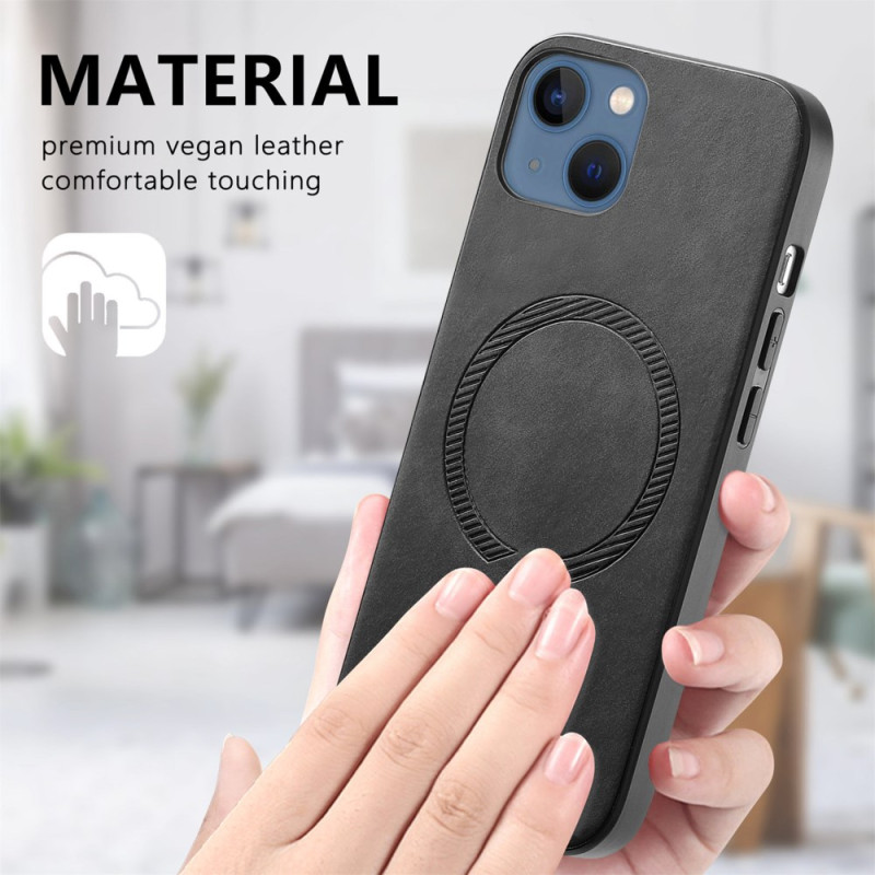 Descubra nuestra funda de piel premium para iPhone 14 Plus, que combina elegancia y protección. Compatible con MagSafe, ofrece una cómoda carga inalámbrica. Con alta protección para la pantalla y la cámara, y lámina magnética integrada para el soporte de coche, esta funda delgada ofrece una protección óptima contra caídas y arañazos.