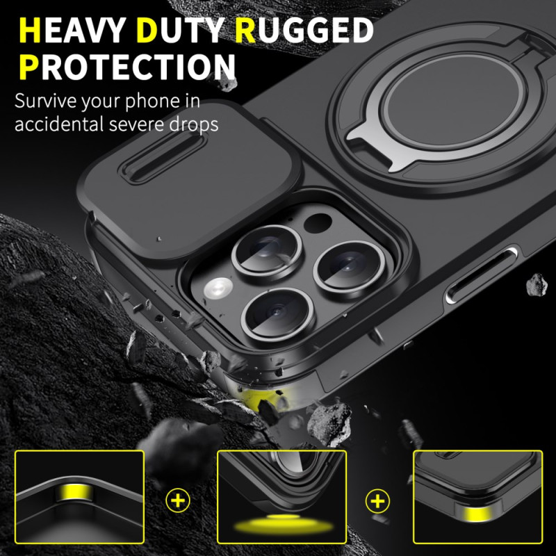 Protege tu iPhone 14 Pro Max con estilo con esta innovadora funda magnética. Con una doble capa de TPU+PC resistente a los impactos, una tapa deslizante para la lente y un anillo de soporte giratorio 360°, combina seguridad y practicidad.