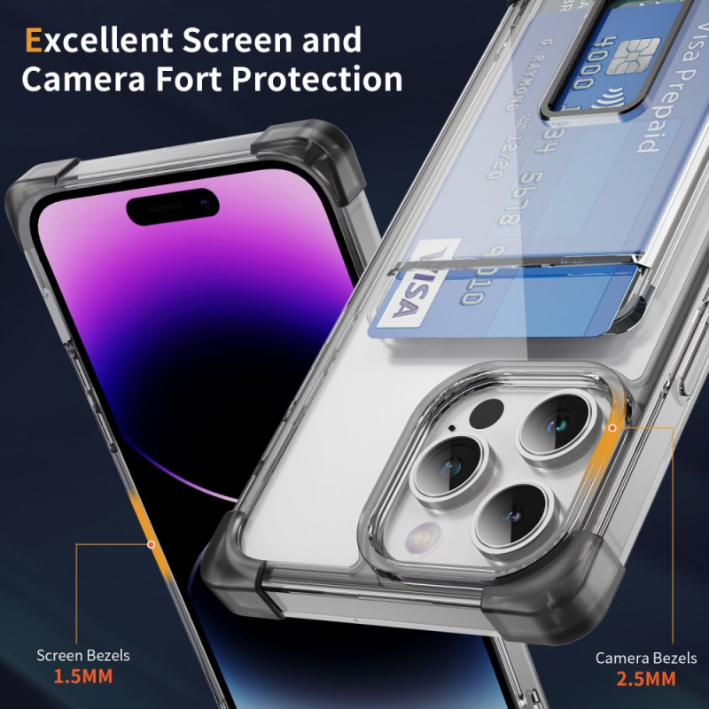 Descubra nuestra innovadora funda protectora para iPhone 14 Pro. Con un soporte multiángulo, un tarjetero ampliado y un diseño transparente, ofrece una protección óptima al tiempo que preserva la estética de tu dispositivo. Sus esquinas reforzadas y su diseño ergonómico proporcionan una protección fiable contra golpes y arañazos.