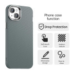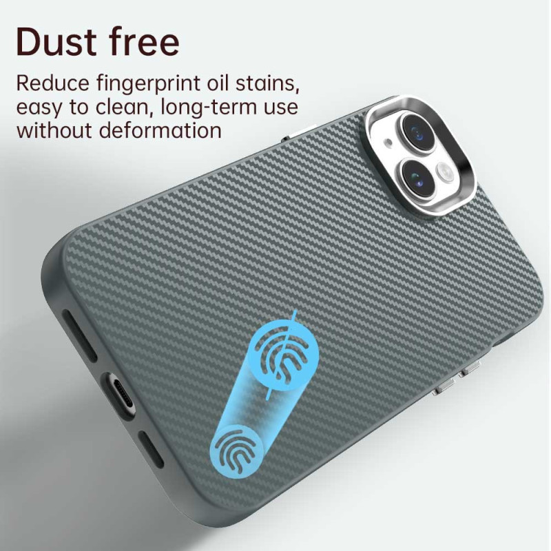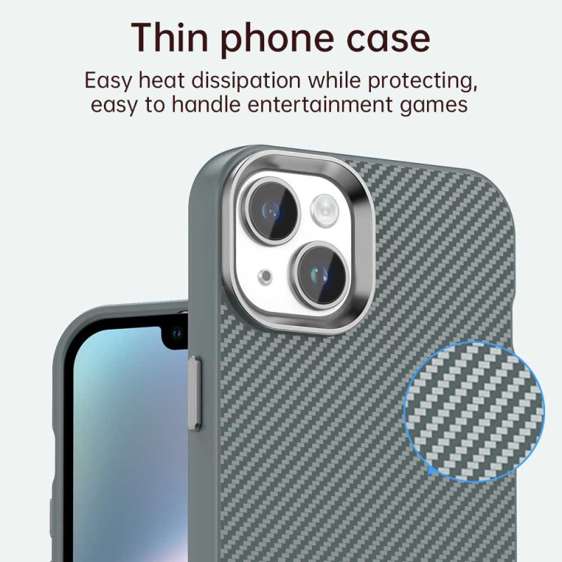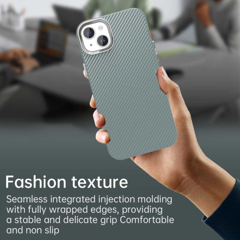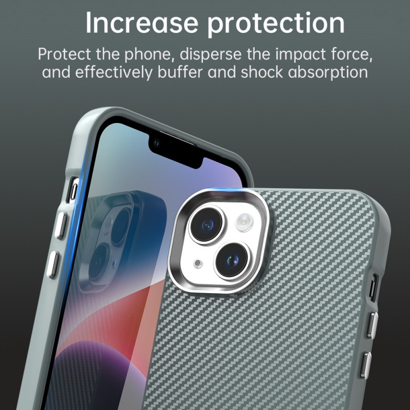 Descubra nuestra elegante funda híbrida para iPhone 14 / 13. Fabricada con materiales de alta calidad, ofrece una protección duradera contra el desgaste diario. La textura de fibra de carbono añade un toque moderno a la vez que mejora el agarre.