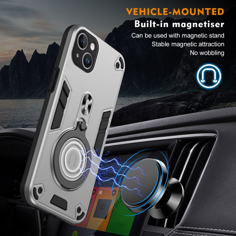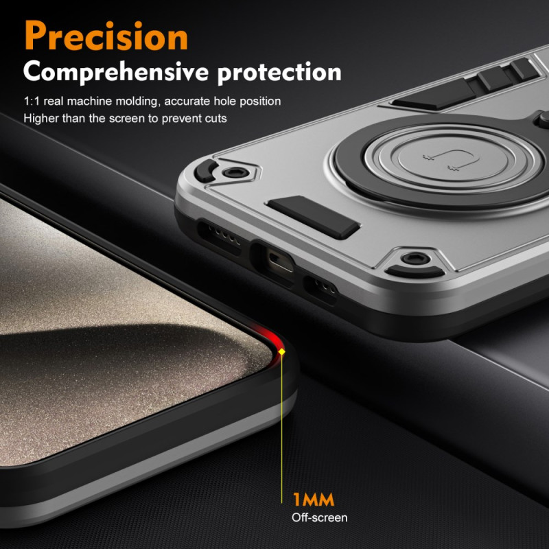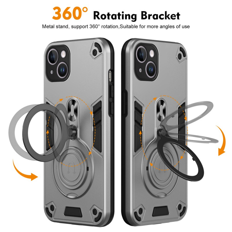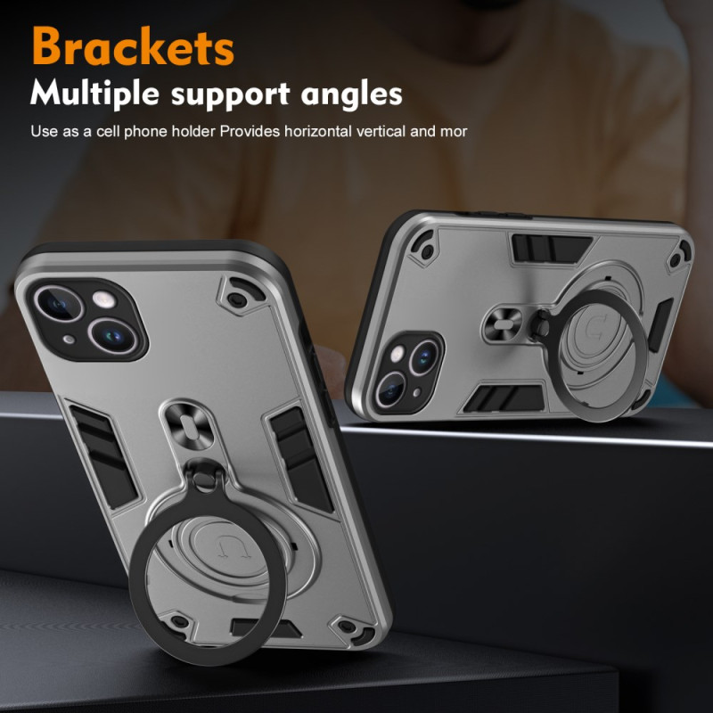 Descubra nuestra innovadora funda protectora para iPhone 15 Plus. Con un soporte giratorio de 360°, ofrece una excelente protección contra caídas y arañazos. Su práctico diseño incluye una placa metálica integrada para facilitar la fijación magnética en el coche.