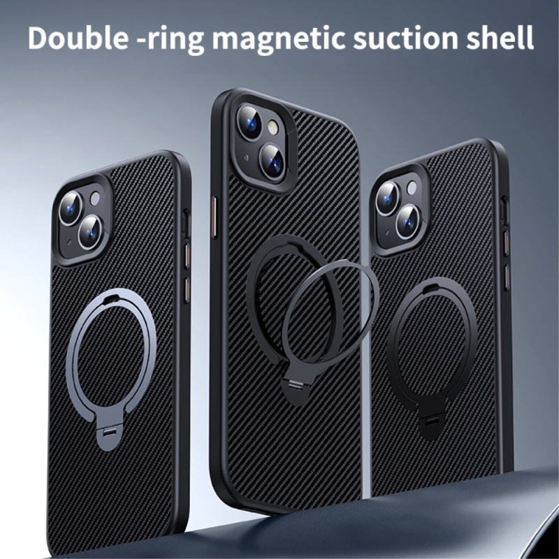 Descubre nuestra robusta funda para iPhone 15 Plus, que ofrece una protección superior y compatibilidad con MagSafe. Con un soporte giratorio de 360°, esta funda de PC+TPU combina durabilidad y funcionalidad. Su textura de fibra de carbono añade estilo y practicidad, mientras que sus bordes elevados e imanes integrados garantizan una protección óptima y una carga inalámbrica eficiente.