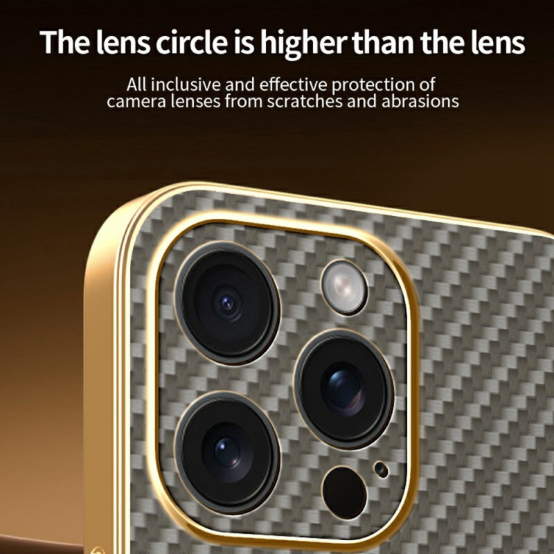 Descubre nuestra elegante y resistente funda para iPhone 15 Pro Max. Fabricada en TPU flexible con un acabado galvánico premium, ofrece una protección superior contra golpes y arañazos. Su textura de fibra de carbono resiste las huellas dactilares, mientras que sus bordes elevados protegen la pantalla y la cámara. Compatible con cargadores magnéticos, esta funda combina estilo y funcionalidad.