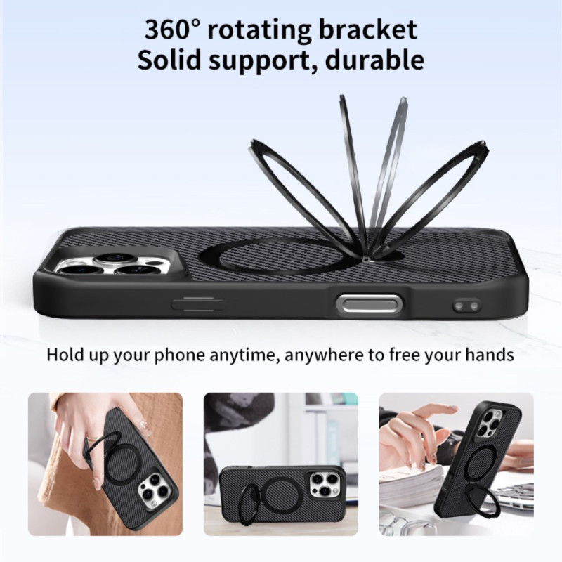 Descubre nuestra innovadora funda para iPhone 15 Pro Max. Con un soporte magnético giratorio de 360 grados, ofrece una protección superior gracias a su diseño de TPU y PC. Compatible con MagSafe, combina funcionalidad y estilo con su diseño de fibra de carbono, al tiempo que garantiza un fácil acceso a todas las funciones de tu teléfono.