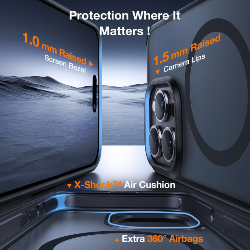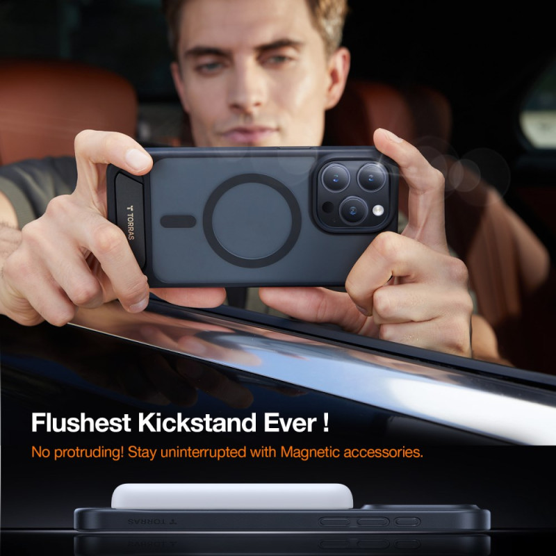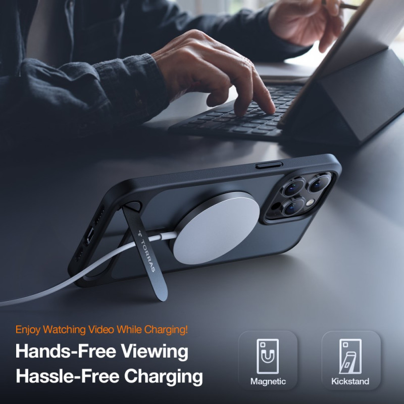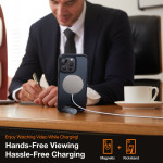 Robusta funda protectora para iPhone 15 Pro Max con soporte integrado. Fabricada en TPU y PC, ofrece una excelente protección contra el desgaste diario sin dejar de ser elegante. Compatible con la carga inalámbrica MagSafe, incorpora potentes imanes para un agarre óptimo.