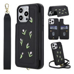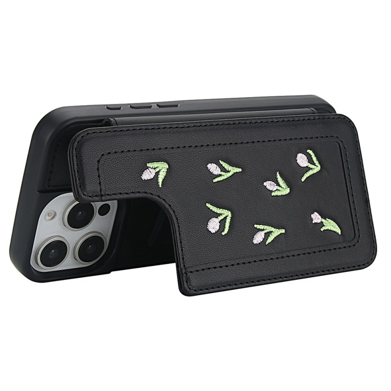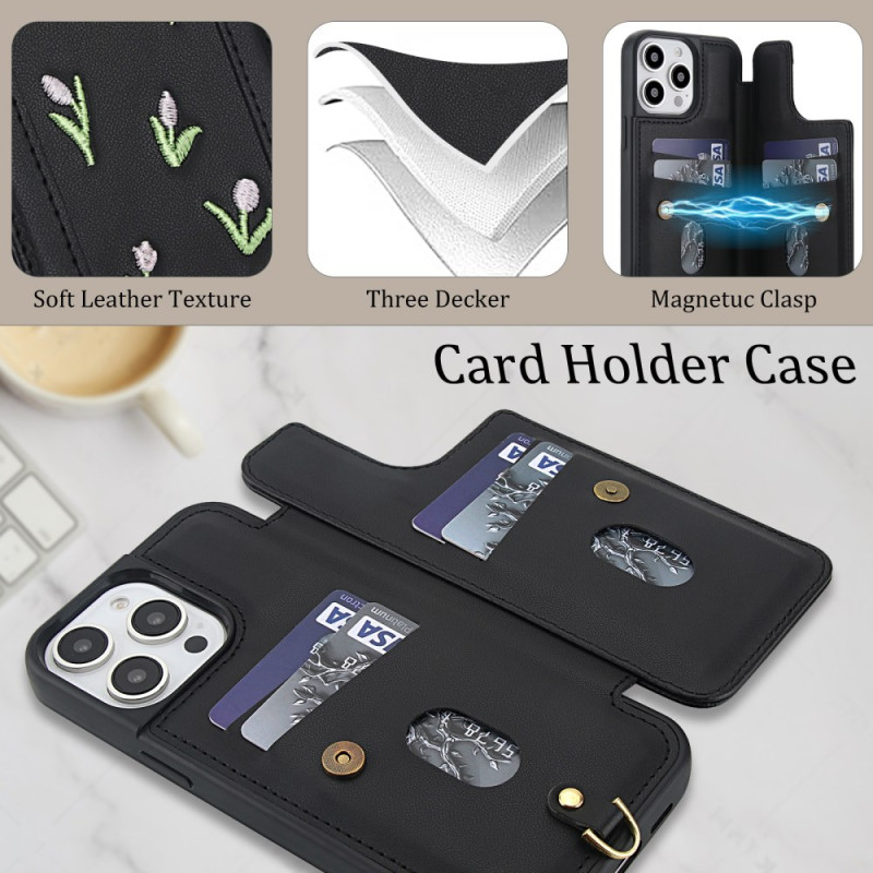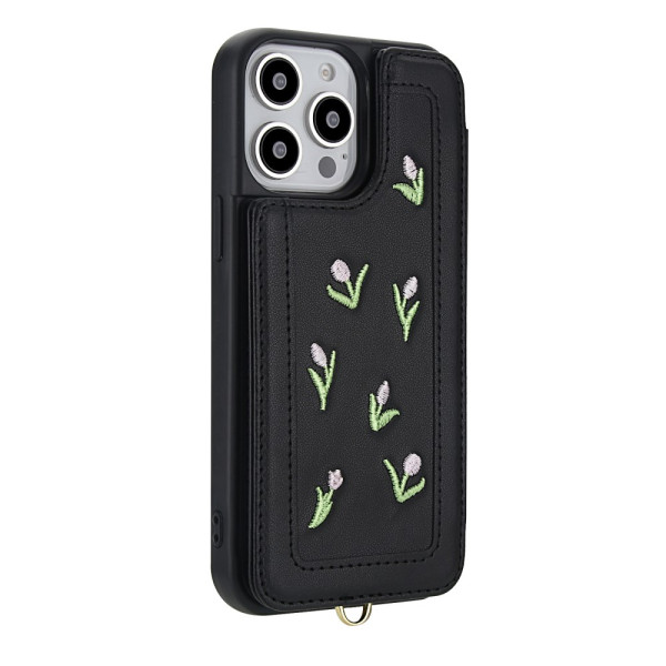 Descubra nuestra elegante funda para iPhone 15 Pro con bordado de tulipanes. Fabricada en suave piel de PU, ofrece un práctico tarjetero, función de soporte y protección total. Versátil, viene con una colgante ajustable para el hombro y una colgante de mano para un transporte versátil.