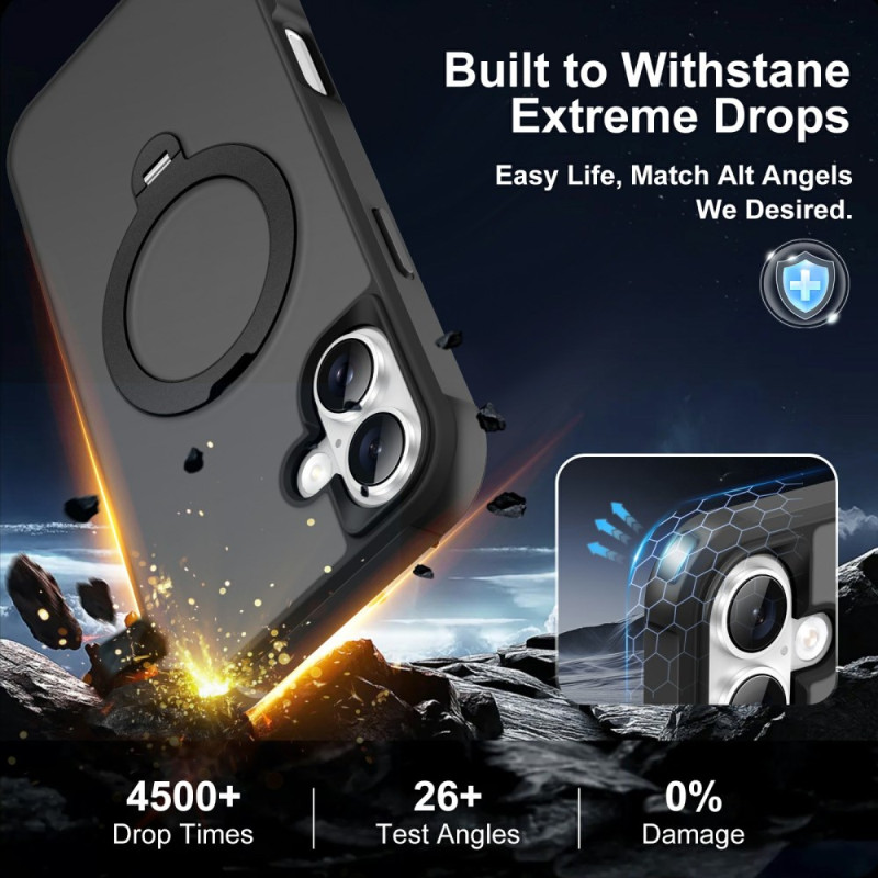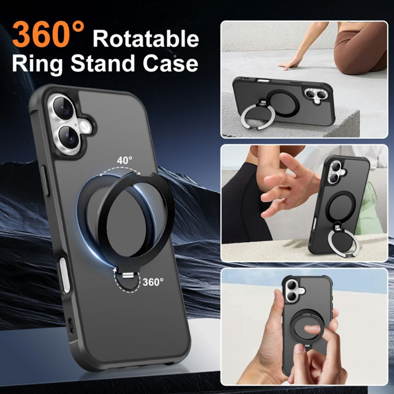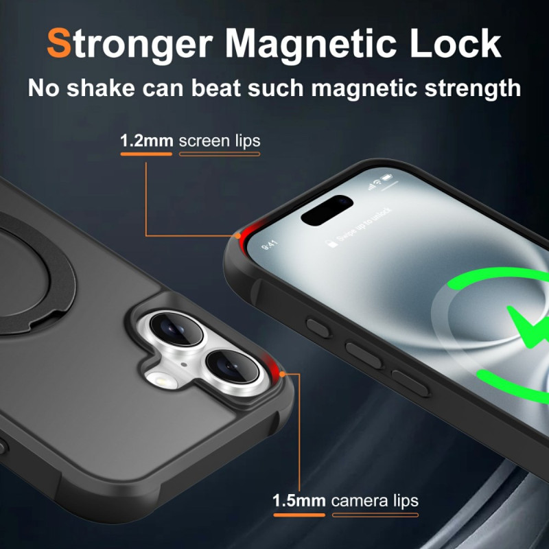 Descubra nuestra funda protectora premium para iPhone 16. Compatible con MagSafe, ofrece una protección superior contra golpes y caídas. Su soporte giratorio integrado permite una visualización manos libres desde múltiples ángulos. Con bordes elevados para la pantalla y la cámara, ofrece una protección completa para tu dispositivo.