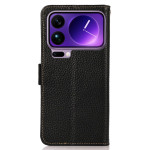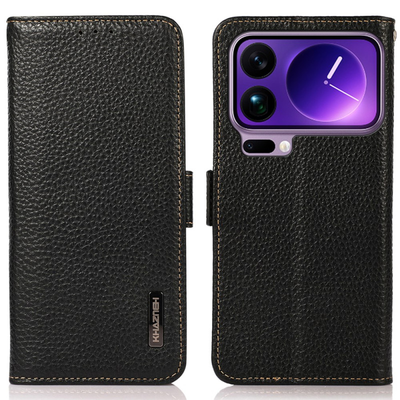 Funda de piel auténtica para Xiaomi 17 Pro Max con elegante textura de lichi. Ofrece protección RFID, ranuras para tarjetas y función de soporte. Diseño delgado con TPU ligero y doble solapa magnética para facilitar su uso y una protección completa contra arañazos y caídas.