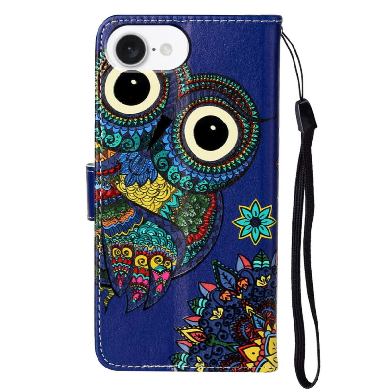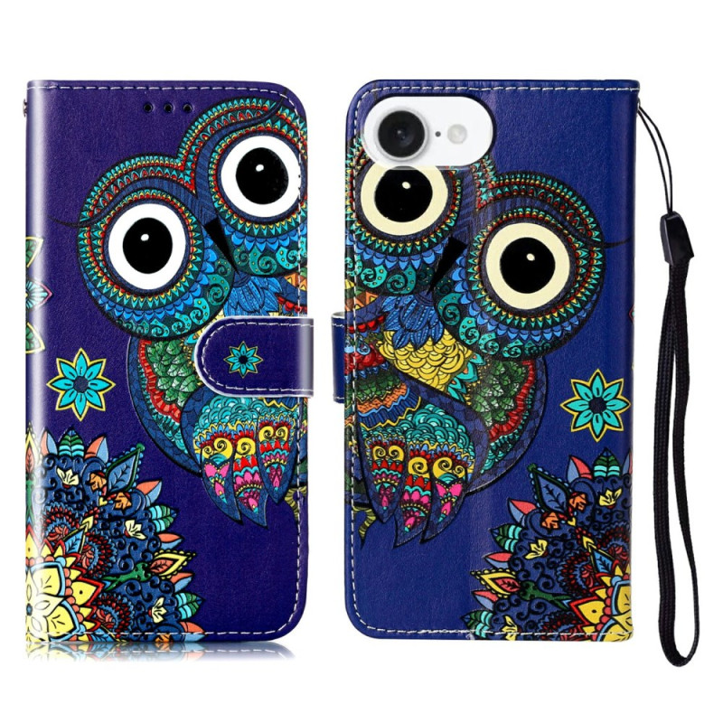 Elegante funda cartera con motivo de búho azul para iPhone 17E / 16E. Diseño práctico con tarjetero, soporte ajustable y colgante de mano. Protección total contra golpes y arañazos. Perfecta para llevar tarjetas y dinero con total seguridad.