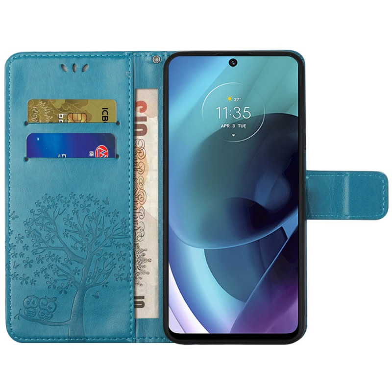 La funda de cuero efecto árbol y búho, con solapa magnética, proporciona protección a tu Moto G51 5G.