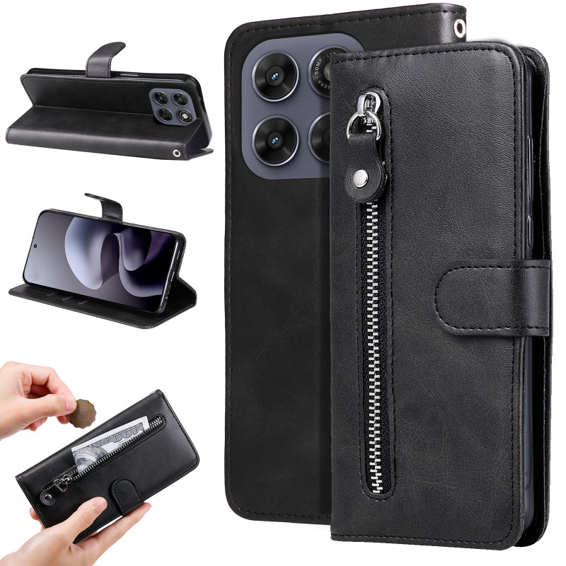 Práctico, incluye tarjetas, un bolsillo para billetes, un compartimento con cremallera y un soporte manos libres plegable.
