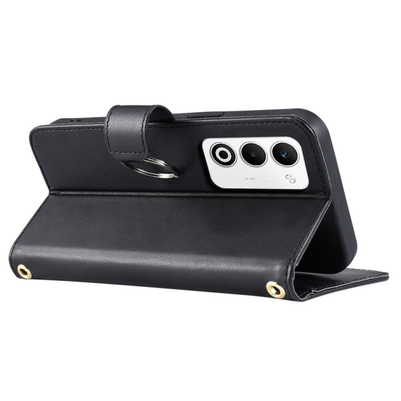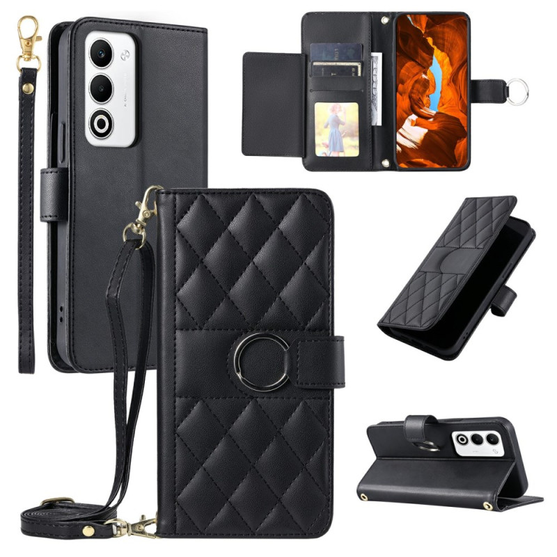 Sofisticada funda monedero para Oppo A5 5G / 4G en piel PU de primera calidad con elegante estampado de diamantes. Cuenta con un anillo de soporte, 5 ranuras para tarjetas, bolsillo para monedas y dos correas de hombro extraíbles para un transporte versátil.