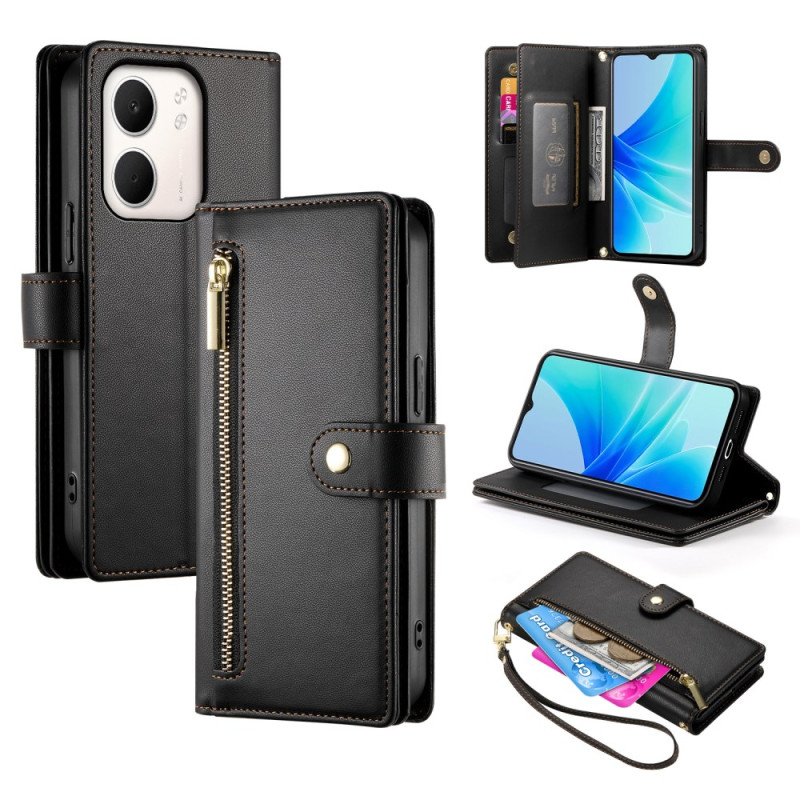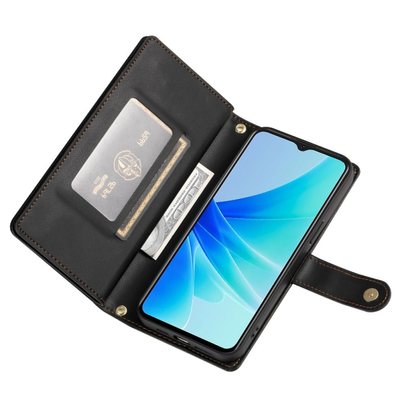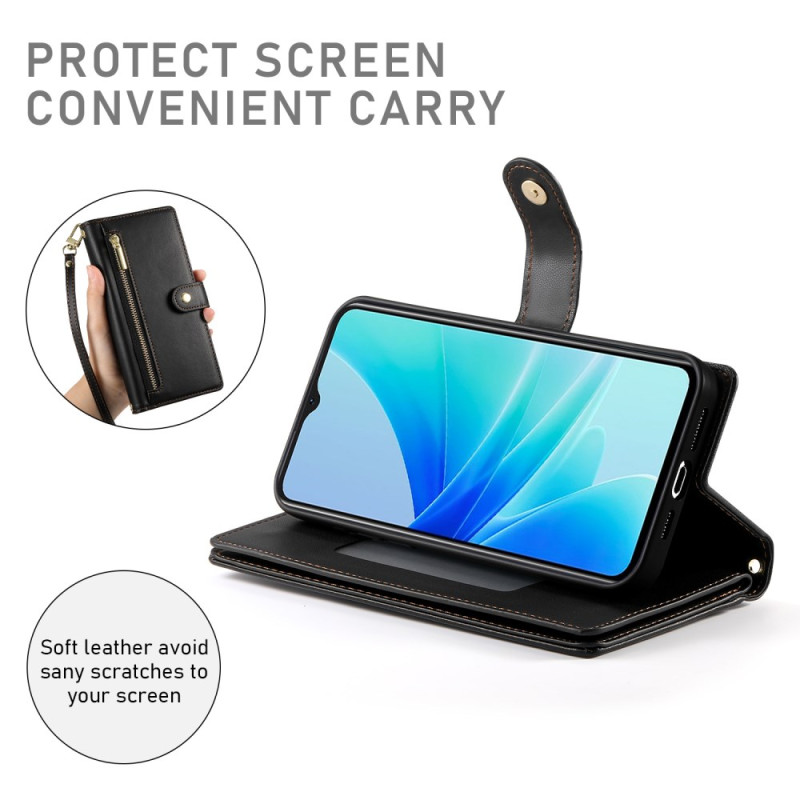Funda multifuncional que combina protección y practicidad. Múltiples ranuras para tarjetas, bolsillo con cremallera y correas ajustables para llevarla con las manos libres. Soporte plegable integrado para una cómoda visualización. Diseño elegante y seguro.