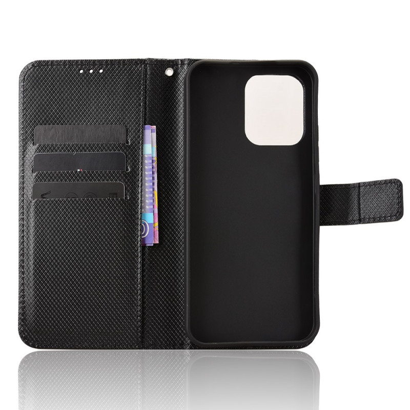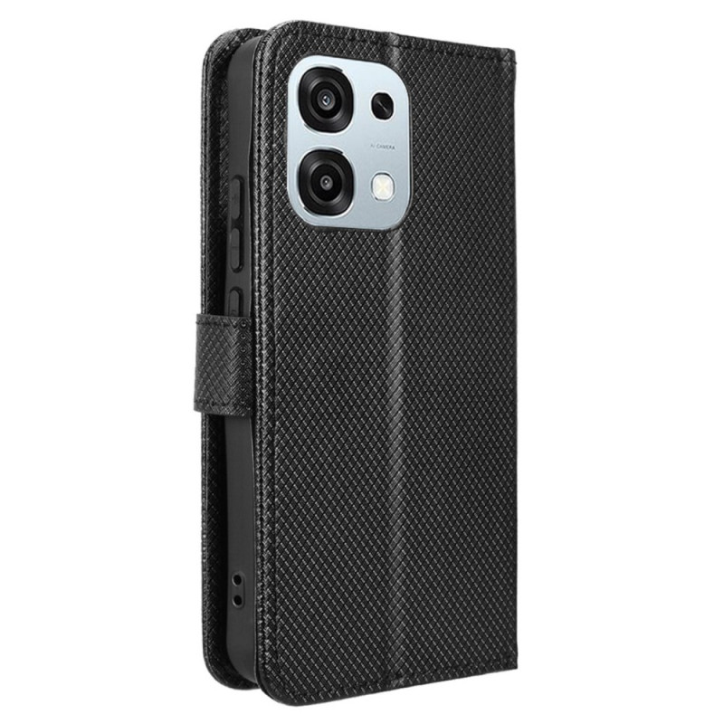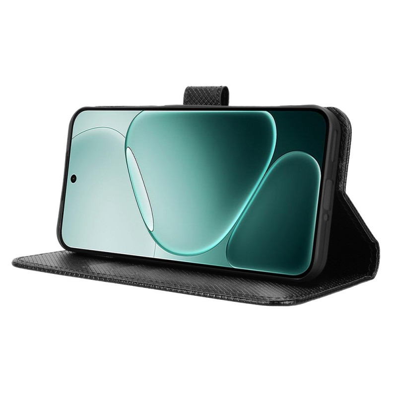 Elegante funda tipo cartera con textura de diamante para tu Oppo A6 Pro 5G. Cuenta con ranuras para tarjetas, un soporte plegable y una práctica colgante de mano. Protección total contra golpes y arañazos. Cierre magnético seguro para un uso diario óptimo.