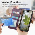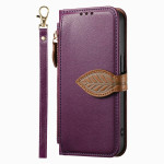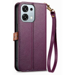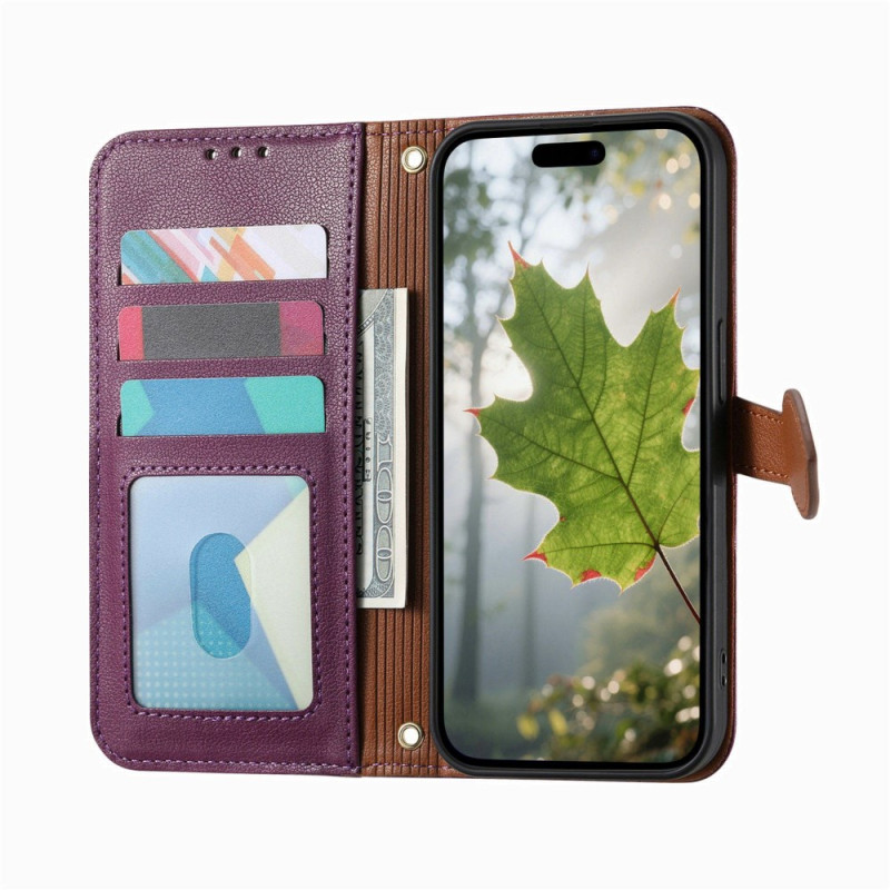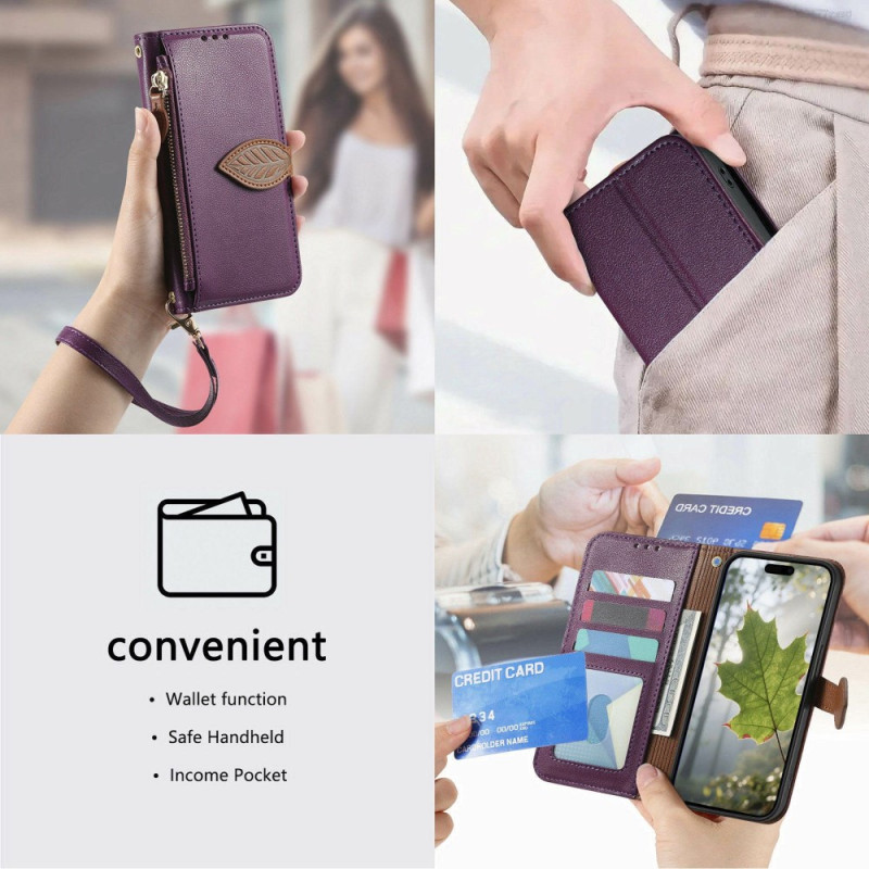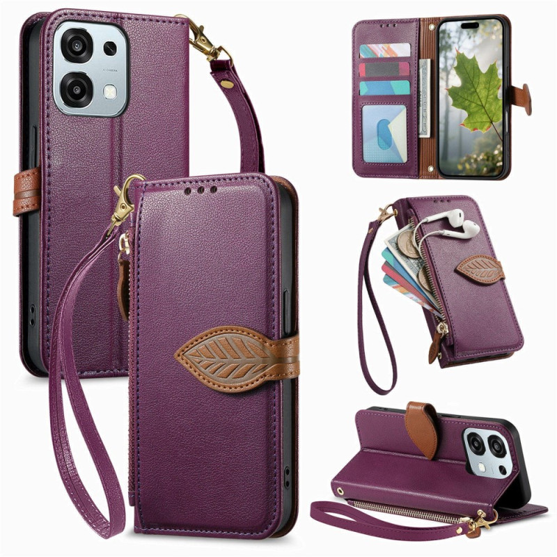 Elegante funda de cuero PU con cierre magnético de hoja para Oppo A6 Pro 5G / 4G. Cuenta con 3 ranuras para tarjetas, 1 bolsillo para efectivo y un bolsillo externo con cremallera. Soporte integrado para visión manos libres y colgante de mano desmontable.