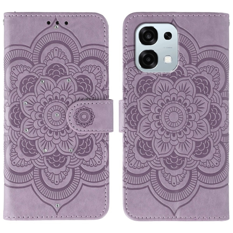 Protege tu Oppo A6 Pro 5G con estilo con esta funda de solapa con un sofisticado diseño de mandala y brillantes diamantes de imitación. Incluye prácticas funciones como ranuras para tarjetas, una colgante