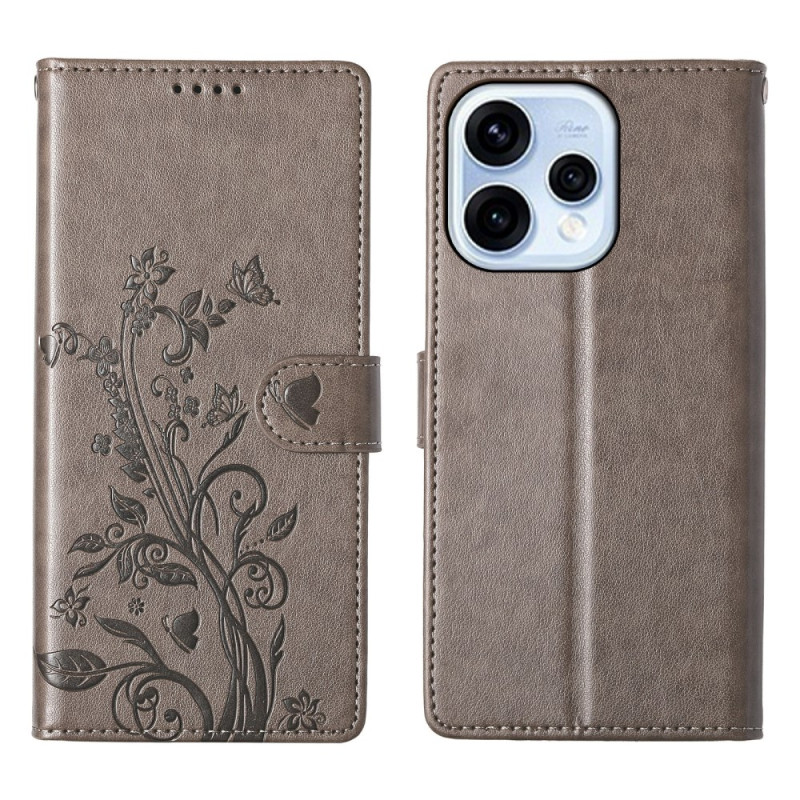 Elegante funda tipo cartera para Oppo Reno 15 5G con motivo de mariposa floral en relieve. Diseño de doble material en piel sintética y TPU suave para una protección óptima. Incluye soporte plegable, ranuras para tarjetas y una práctica colgante de mano.
