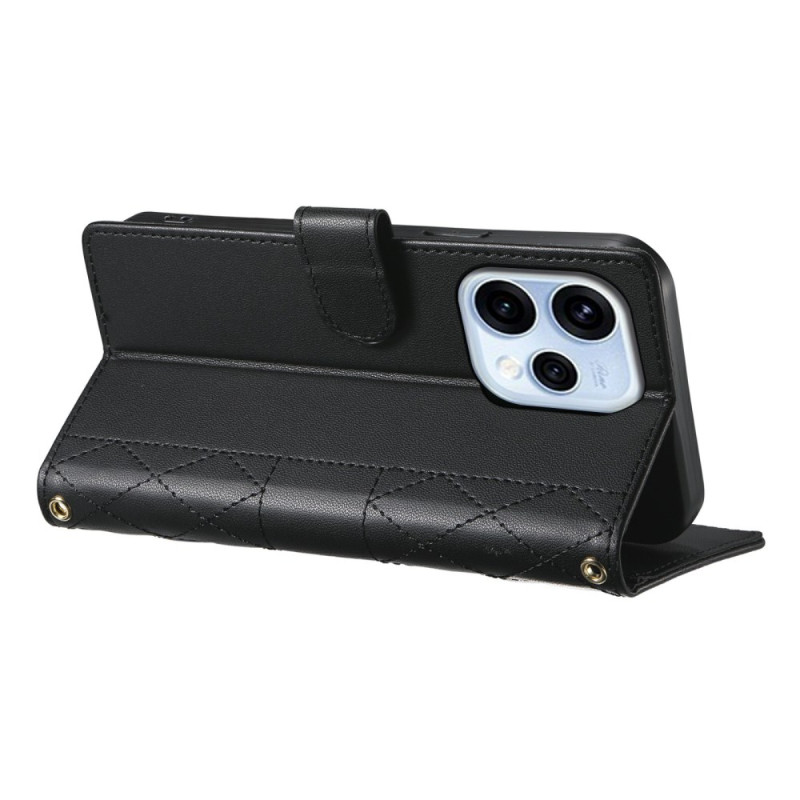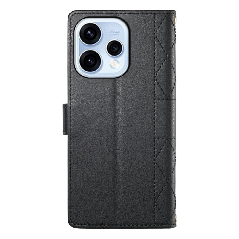 Elegante funda tipo cartera con diseño acolchado de diamantes para Oppo Reno 15 5G. Dispone de 3 ranuras para tarjetas, 1 bolsillo para efectivo, función de soporte integrada y colgante para el hombro ajustable y desmontable. Protección completa contra golpes y arañazos.