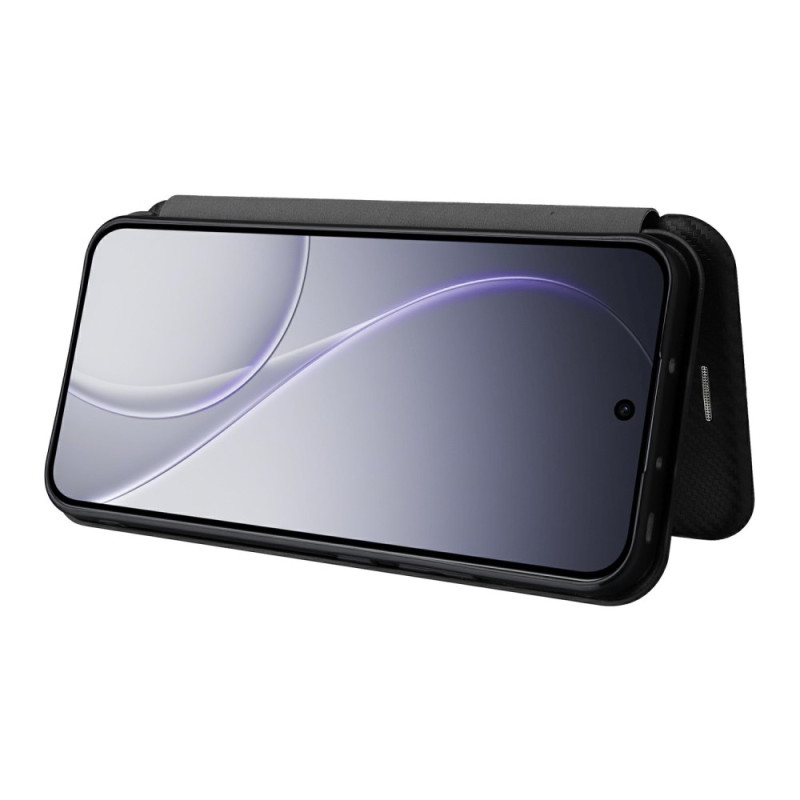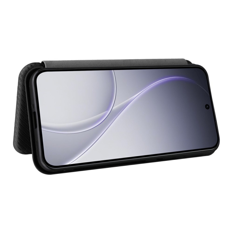 Elegante funda con textura de fibra de carbono antiarañazos para Oppo Reno 15 5G. Robusta protección de doble capa, ranura para tarjetas integrada, cierre magnético seguro y función de soporte manos libres. Diseño sofisticado que combina estilo y practicidad.