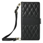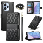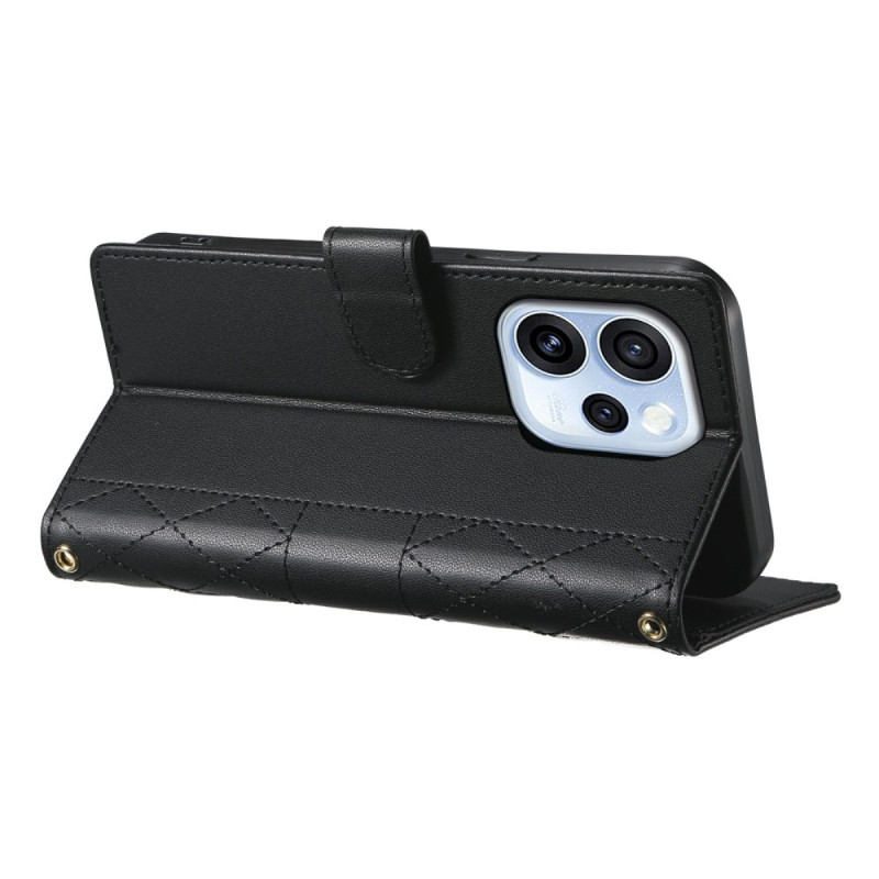Elegante funda cartera de cuero PU con diseño acolchado de diamantes para Oppo Reno 15 F 5G. Dispone de 3 ranuras para tarjetas, 1 bolsillo para dinero en efectivo, función de soporte integrada y correas desmontables y ajustables para el hombro (70-150 cm).
